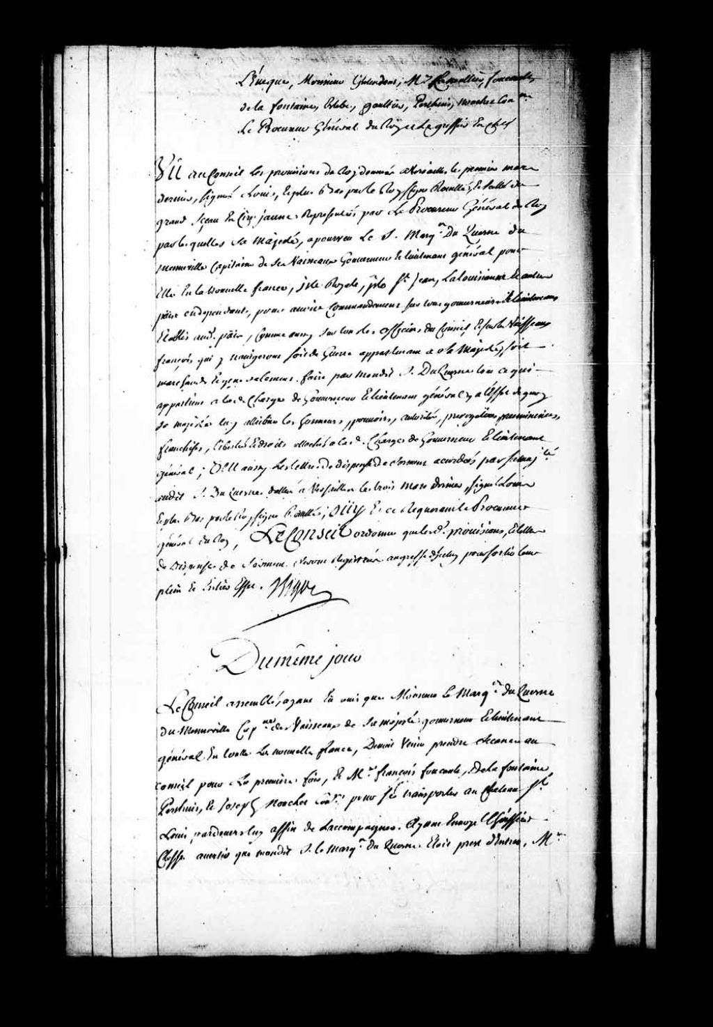 «Le Conseil assemblé ayant eu avis que monsieur le marquis Duquesne de Menneville, capitaine des vaisseaux de Sa Majesté, gouverneur et lieutenant général en toute la Nouvelle-France, devait venir prendre séance au Conseil pour la première fois, et maître François Foucault, de Lafontaine, Perthuis et Joseph Nouchet, conseillers, pour se transporter au château Saint-Louis par devers lui afin de l'accompagner, ayant envoyé l'huissier Clesse avertir que mon dit sieur le marquis Duquesne était près d'entrer, messieurs Estèbe et Gaultier, conseillers, sont allés au devant le recevoir, et peu de temps après sont entrés avec les dits sieurs Foucault de Lafontaine, Perthuis et Nouchet, après mon dit sieur le gouverneur général qui a pris sa place et remercié la compagnie», 7 août 1752, Archives nationales à Québec, Fonds Conseil souverain, (03Q,TP1,S28,P20786).