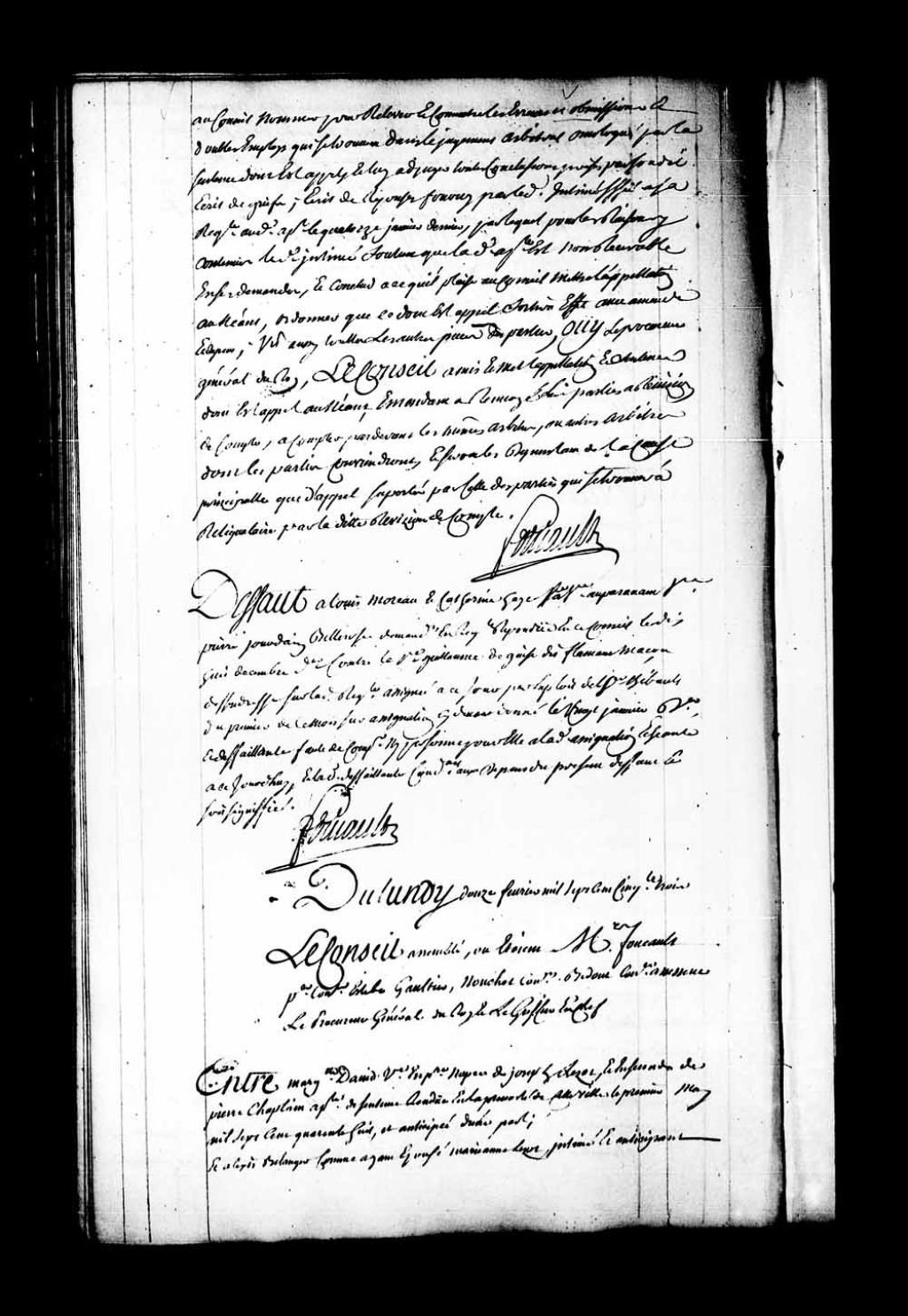 Appel mis à néant dans la cause entre Marguerite David, veuve en premières noces de Joseph Lezot et, en secondes, de Pierre Chaplain, appelante de la sentence rendue en la Prévôté de Québec, le 1er mai 1748, contre Alexis Bélanger, comme époux de Marianne Lezo. Le Conseil a mis les parties hors de cour et de procès sur la demande originaire de Bélanger en la Juridiction de Beaupré portée par exploit du 13 mars 1745, 12 février 1753, Archives nationales à Québec, Fonds Conseil souverain, (03Q,TP1,S28,P20860).