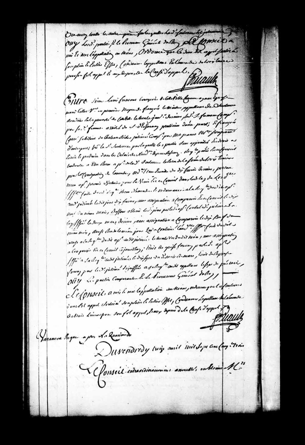 Appel mis à néant dans la cause entre François Simonnet, notaire royal en la Juridiction de Montréal, veuf en premières noces de Marguerite Bougret Dufort, auparavant veuve de Léger Bourgy, contre Marguerite Bourgy, veuve Jean Lefort, au nom et comme héritière de feu Léger Bourgy, son frère, stipulante par Marguerite Lefort, sa fille, veuve de Pierre Noël. Appel mis à néant en ce qu'il n'est alloué par la dite sentence que la somme de 115 livres pour le chapitre des dépens. Le Conseil ordonne que le dit chapitre de dépens sera augmenté de la somme de 140 livres. La sentence au résidu sortissant effet. Simonnet est condamné aux dépens des causes principale et d'appel, 13 avril 1753, Archives nationales à Québec, Fonds Conseil souverain, (03Q,TP1,S28,P20877).