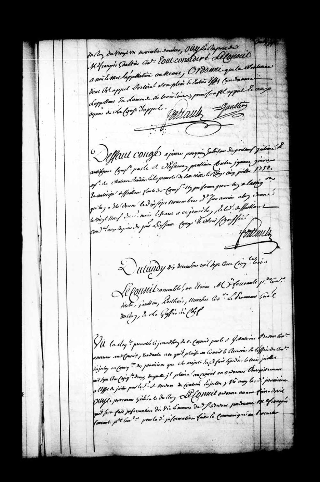 Arrêt qui ordonne, avant de faire droit, qu'il sera fait information des vie et moeurs de Jean-Antoine Bedout, nommé par Sa Majesté, le 31 juillet 1752, conseiller au Conseil Supérieur. La dite information à être faite devant maître François Foucault, premier conseiller, 10 décembre 1753, Archives nationales à Québec, Fonds Conseil souverain, (03Q,TP1,S28,P20954).