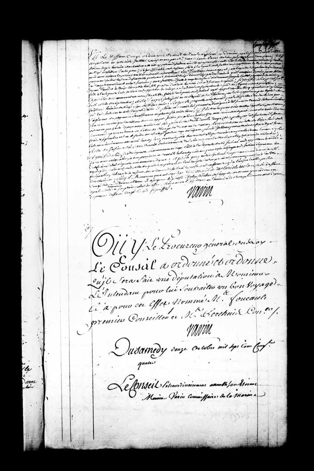 Arrêt qui ordonne que par maître François Foucault, premier conseiller, il sera fait information des vie et moeurs de Henri Hiché, procureur du Roi en la Prévôté et Amirauté de Québec, nommé par lettres de Sa Majesté, le 15 mai 1754, membre du Conseil Supérieur de la Nouvelle-France