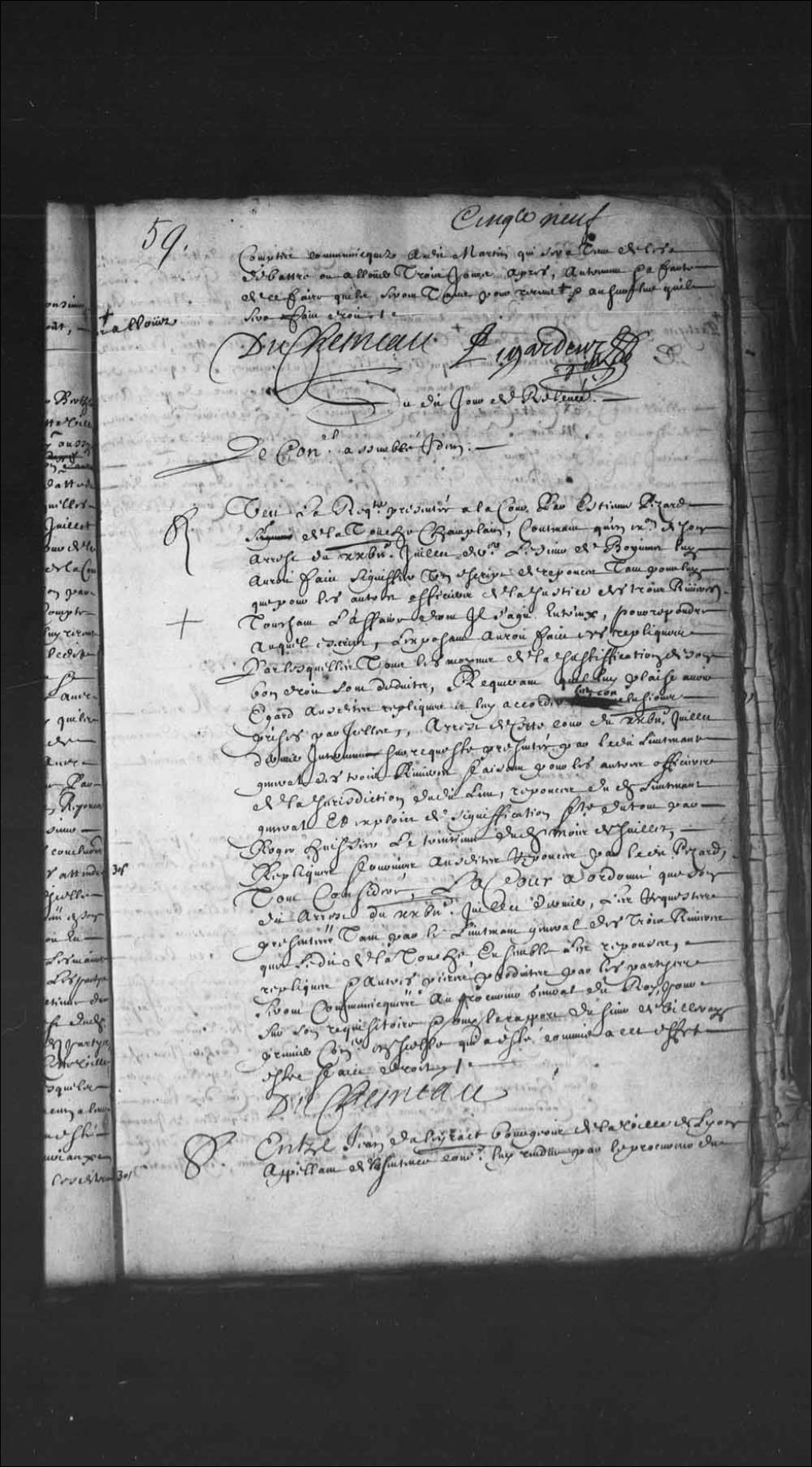 - Transcription du texte avec orthographe modernisée : «Entre Jean DALYRACT bourgeois de la ville de Lyon appelant de la sentence contre lui rendue par le procureur du Roi en la prévôté royal de cette ville en date du deuxième du présent mois au profit de Daniel Grisolon sieur Duluth d'une part, et Pierre DUQUET notaire royal en cette ville au nom et comme procureur dudit sieur Duluth intimé d'autre. Parties ouïes, vu ladite sentence sus-datée, le procès et pièces sur lesquelles elle est intervenue, requête de l'appelant contenant ses griefs et moyens d'appel, arrêt de cette Cour rendu en conséquence le huitième du présent mois, signification faite d'icelui avec assignation à ce jour par Roger huissier le même jour, tout considéré, dit a été que ledit Duquet audit nom, prendra communication au greffe de la Cour de la requête contenant les griefs et moyens d'appel de l'appelant pour en venir à jeudi prochain. DUCHESNEAU.»