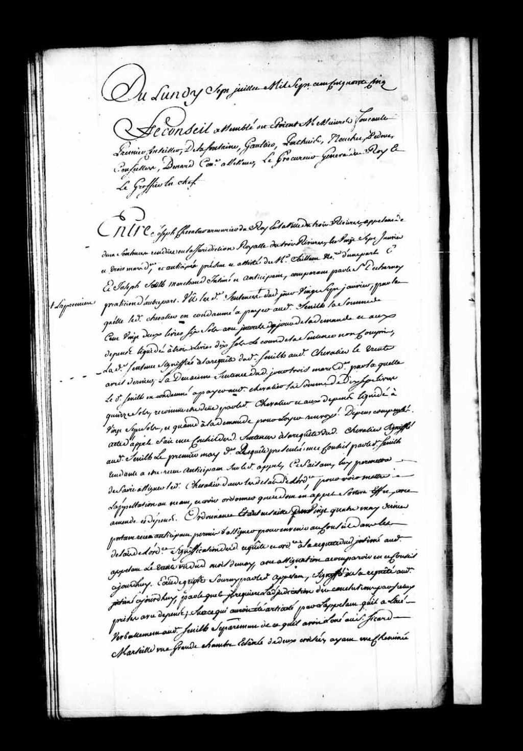 Arrêt qui ordonne, avant de faire droit, que les arrêts feront respectivement preuve par enquête devant le lieutenant général des Trois-Rivières, dans la cause entre Joseph Chevalier, armurier du Roi en la ville des Trois-Rivières et appelant des sentences rendues en la Juridiction des Trois-Rivières, les 27 janvier et 3 mars 1755, contre Joseph Senil, marchand, 7 juillet 1755, Archives nationales à Québec, Fonds Conseil souverain, (03Q,TP1,S28,P21152).