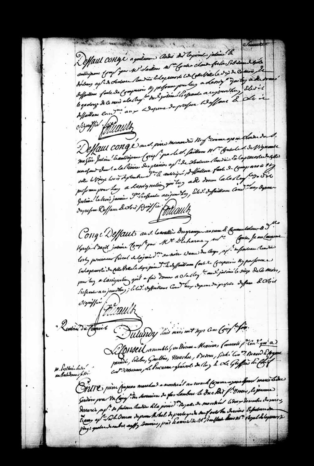Arrêt qui accorde défaut-congé à Pierre Normandin, négociant, comme ayant l'ordre du sieur Massin, contre le sieur Vigneault, marchand de la Rivière-des-Prairies et appelant de la sentence rendue en la Prévôté de Québec, le 23 septembre 1755
