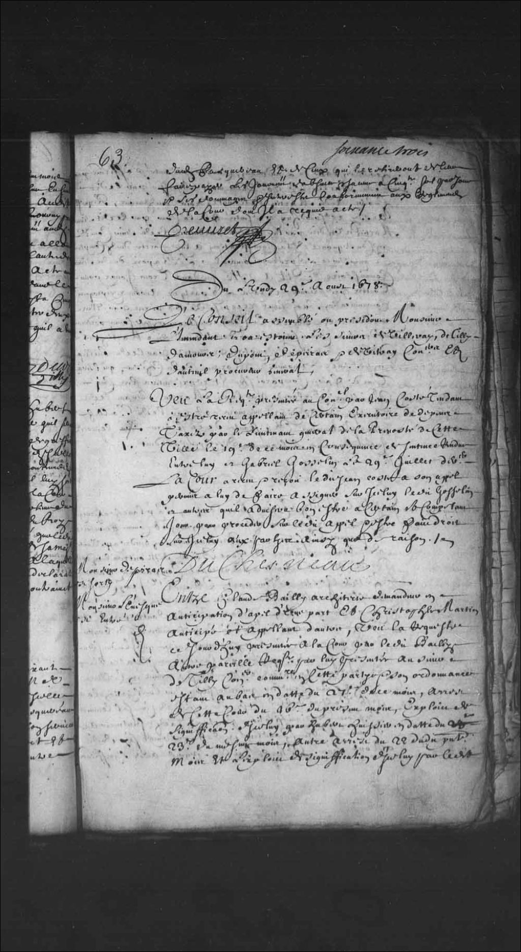 Transcription du texte avec orthographe modernisée : «Monsieur Depeiras est sorti. Monsieur l'évêque est entré. Entre Claude Bailly architecte demandeur en anticipation d'appel d'une part, et Christophe Martin anticipé et appelant d'autre, vu la requête ce jourd'hui présentée à la Cour par ledit Bailly, autre pareille requête par lui présentée au sieur de Tilly, conseiller commissaire en cette partie et son ordonnance étant au bas en date du 27e de ce mois, arrêt de cette Cour du seizième du présent mois, exploit de signification d'icelui par Hubert huissier en date du 23e du même mois, autre arrêt du 22 dudit présent mois, et l'exploit de signification d'icelui, par ledit Hubert en date du lendemain, compte présenté et affirmé par ledit Bailly le 20e dudit mois, signifié par ledit Hubert audit Martin le vingt-trois dudit mois, requête aussi ce jourd'hui présentée à la Cour par ledit sieur Martin et un dire par lui produit par-devant ledit sieur commissaire, en conséquence de la signification à lui faite dudit compte, et ouï sur ce le procureur général, le rapport dudit sieur commissaire, dit a été que dans trois jours pour toutes préfixions et délais, les parties auront réciproquement communication sous leurs récépissés des pièces par elles produites au procès et comparaîtront en personnes par-devant ledit sieur commissaire pour donner par ledit Martin ses débats contre les comptes présentés par ledit Bailly en présence des nommés Moreau et Duchesne qu'il sera tenu de faire comparaître et représenter les cinq registres déclarés par ledit Moreau suivant ledit arrêt du 22 du présent mois et par ledit Bailly son soutenement, et à faute de ce faire sera le procès jugé sur ce qui se trouvera d'écrit et produit. DUCHESNEAU.»