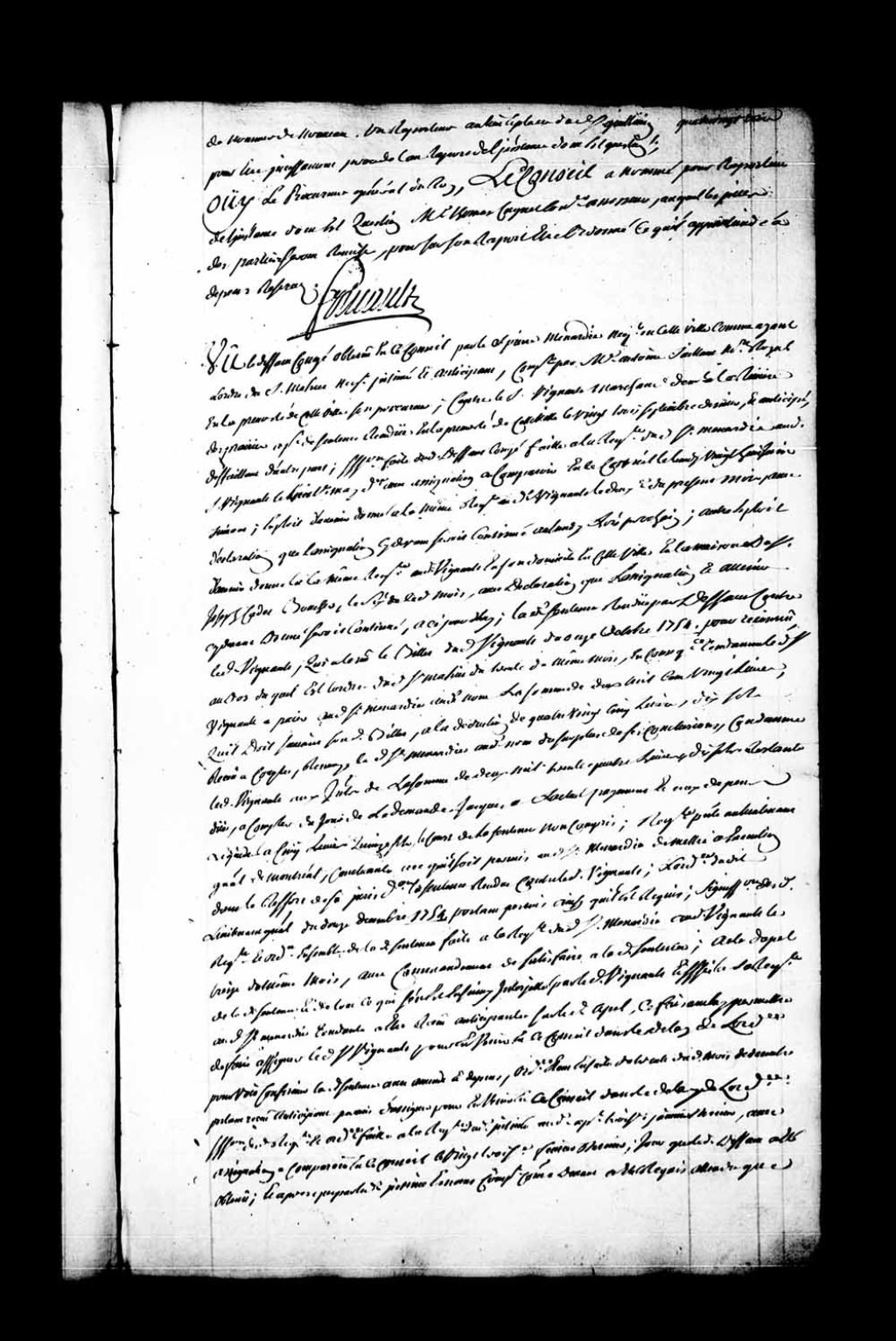 Arrêt qui déclare bien et dûment obtenu le défaut-congé accordé au sieur Pierre Ménardie, négociant en la ville de Québec, comme ayant l'ordre du sieur Maheu, négociant, contre le sieur Vigneault, marchand de la Rivière-des-Prairies et appelant de la sentence rendue en la Prévôté de Québec, le 23 septembre 1755. Le Conseil, adjugeant le profit du dit défaut-congé, a déchu Vigneault de son appel et ordonne que ce qui est en appel sortira son plein et entier effet. Le sieur Vigneault est condamné à 12 livres d'amende et aux dépens du présent défaut-congé, 12 juillet 1756, Archives nationales à Québec, Fonds Conseil souverain, (03Q,TP1,S28,P21261).