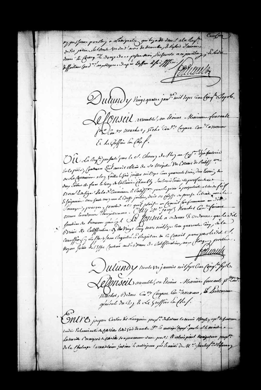 Appel mis à néant de la sentence rendue en l'Amirauté de Québec, le 18 décembre 1756, dans la cause entre Jacques Cartier dit Langevin, propriétaire du bateau la Marie-Thérèse, contre Alexis Pinet, navigateur, propriétaire de la chaloupe la Madeleine, intimé. Jacques Cartier dit Langevin est condamné à 3 livres d'amende pour son «fol appel» et aux dépens de la cause d'appel, 31 janvier 1757, Archives nationales à Québec, Fonds Conseil souverain, (03Q,TP1,S28,P21313).