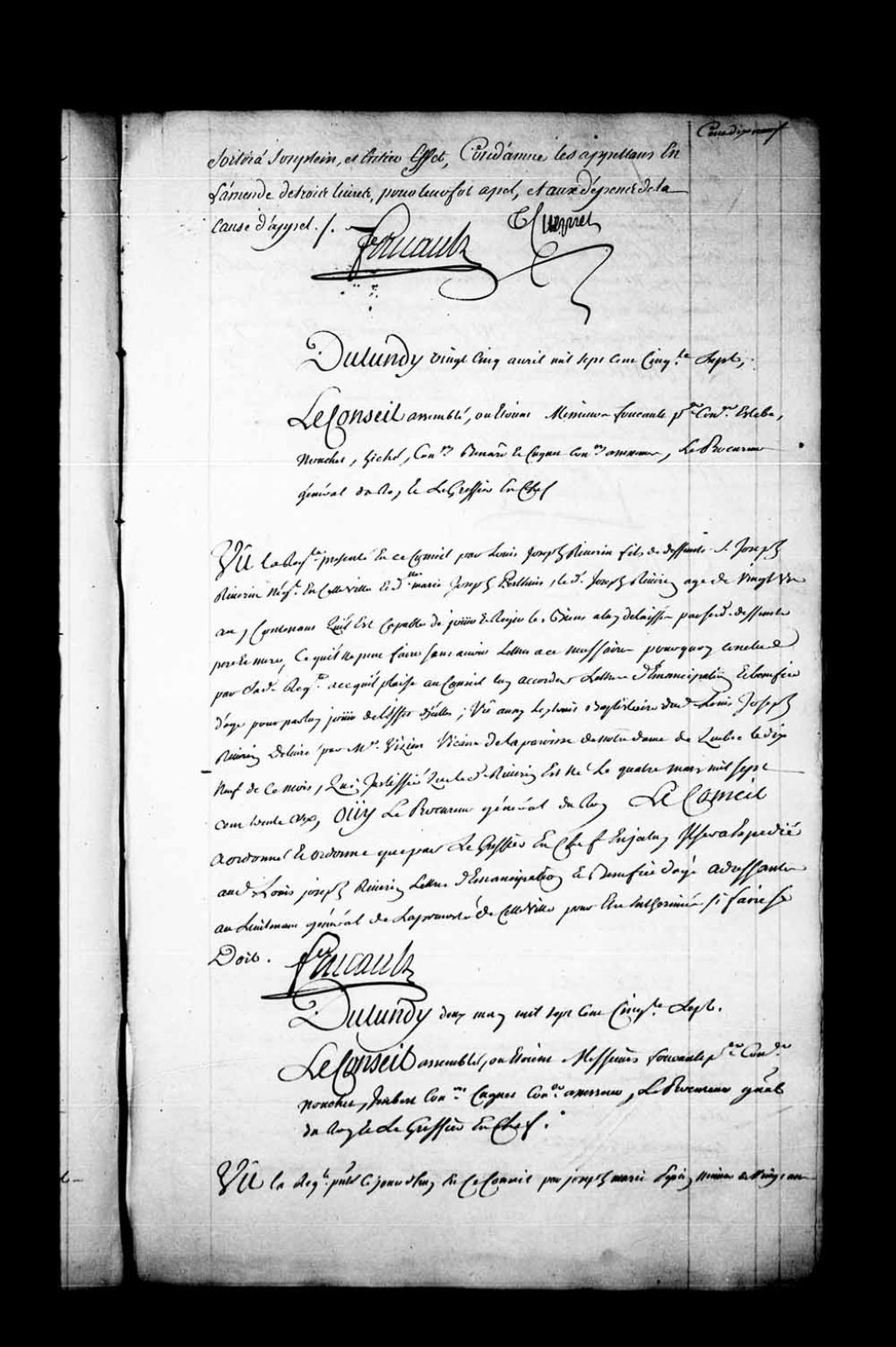 Arrêt qui ordonne, au greffier en chef du Conseil, d'expédier des lettres d'émancipation et bénéfice d'âge à Louis-Joseph Riverin, fils de défunt Joseph Riverin, négociant en la ville de Québec, et de Marie-Joseph Perthuis. Le dit Riverin né à Québec, le 4 mars 1736