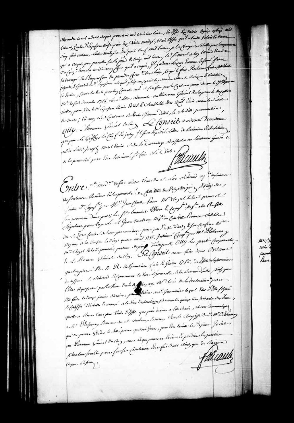 Arrêt qui ordonne, dans la cause entre Madeleine Trefflé Rottot, veuve de Luc Schmidt, appelante des sentences rendues en la Prévôté de Québec, les 21 juin et 22 juillet 1757, contre les sieurs Emmanuel Weis et compagnie, négociants à La Rochelle, que les pièces d'un inventaire fait, en juillet 1756, des effets de la succession du défunt sieur Schmidt seront communiquées au sieur Charnay, procureur du sieur Malroux, aux dits noms. Cependant, le sieur de Charnay ne pourra garder la dite pièce plus de trois jours, 13 mars 1758, Archives nationales à Québec, Fonds Conseil souverain, (03Q,TP1,S28,P21412).