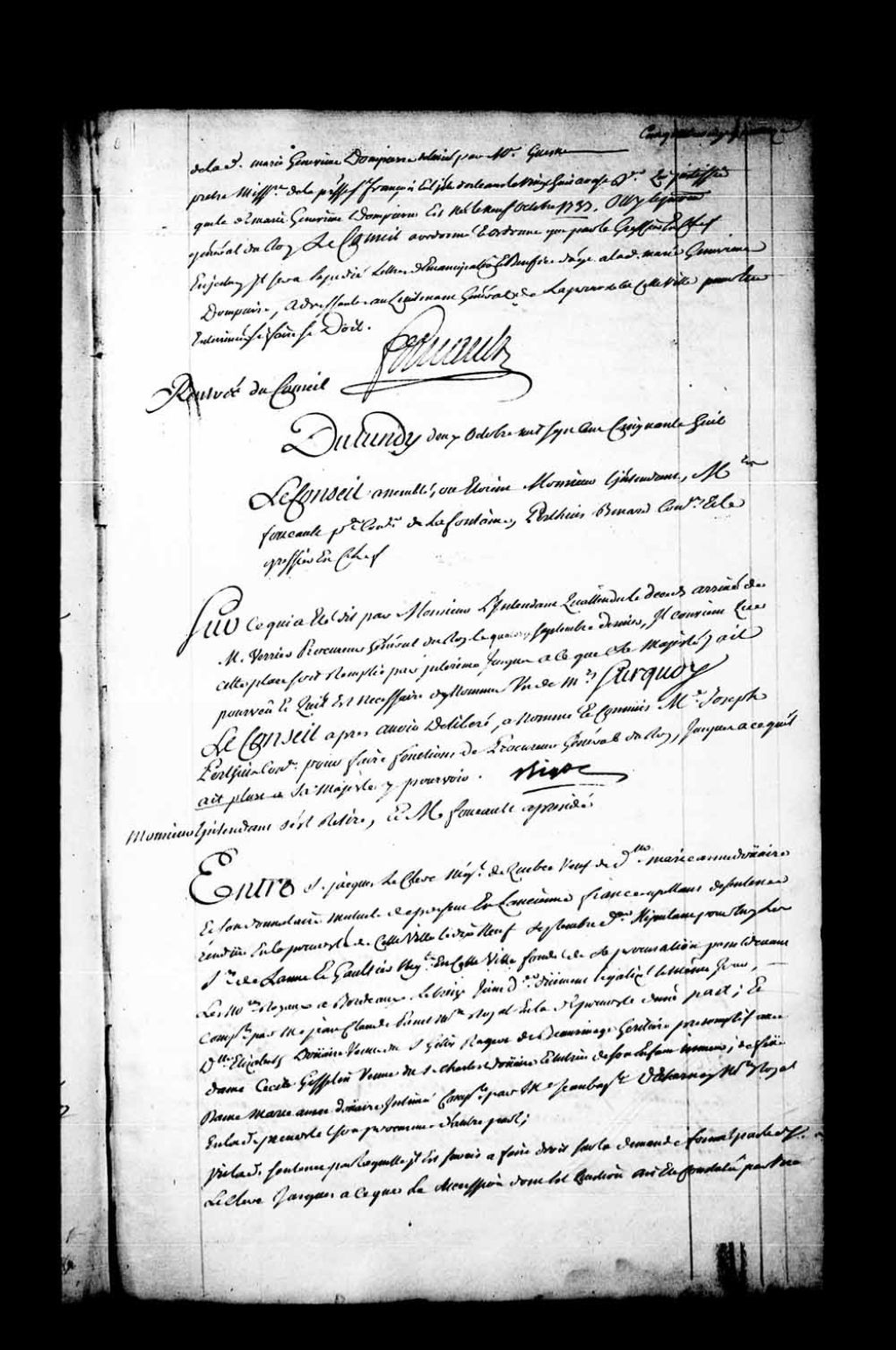 «Sur ce qui a été dit par monsieur l'intendant qu'attendu le décès arrivé de monsieur Verrier, procureur général du roi, le 14 septembre 1758, il convient que cette place soit remplie par intérim jusqu'à ce que Sa Majesté y ait pourvu et qu'il est nécessaire d'y nommer un des messieurs. Sur quoi le Conseil, après avoir délibéré, a nommé et commis maître Joseph Perthuis, conseiller, pour faire fonctions de procureur général du Roi jusqu'à ce qu'il ait plu à Sa Majesté d'y pourvoir»