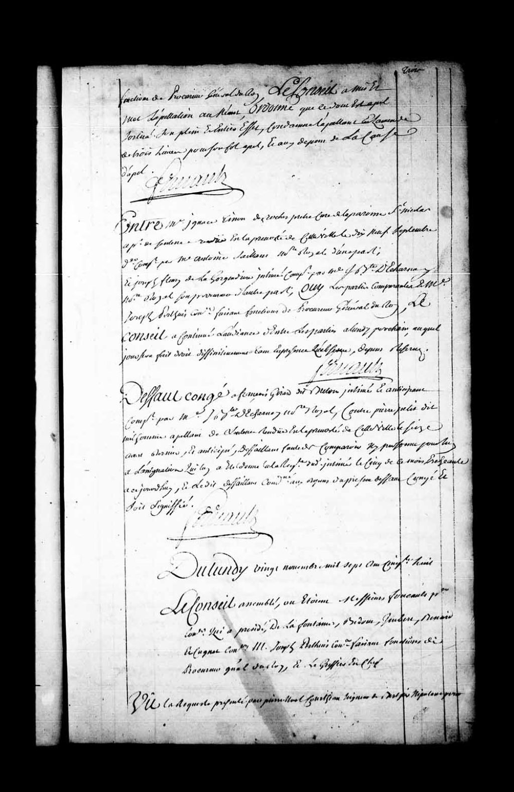 Arrêt qui continue l'audience à lundi prochain auquel jour sera fait droit définitivement, tant en présence qu'absence, dans la cause entre maître Ignace Tinon Desroches, prêtre, curé de Saint-Nicolas, représenté par maître Antoine Saillant, appelant de la sentence rendue en la Prévôté de Québec, le 19 septembre 1758, contre Joseph Fleury de la Gorgendière, représenté par maître Jean-Baptiste Pourguis