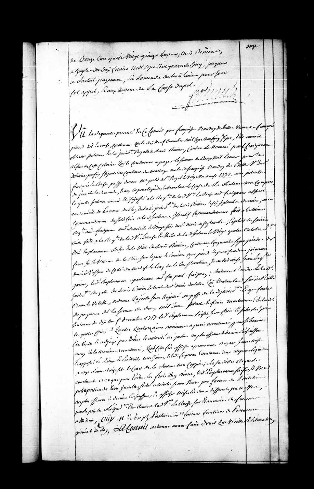 Arrêt qui ordonne, avant de faire droit, que visite et estimation de l'emplacement en contestation sera faite par experts et gens s'y connaissant dans la cause entre Françoise Baudry Desbuttes, veuve de François Picard dit Laroche contre le nommé Paul Fraigneau, absent de cette colonie, 11 décembre 1758, Archives nationales à Québec, Fonds Conseil souverain, (03Q,TP1,S28,P21490).