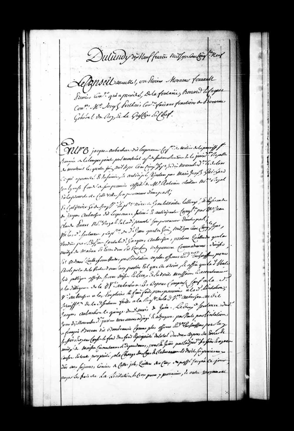 Appel mis à néant des sentences rendues en la Juridiction de Montréal, les 4 juin 1757 et 10 novembre 1758, dans la cause entre Jacques Aubuchon dit Lespérance, capitaine de milice de la paroisse Saint-François-de-la-Longue-Pointe, près de Montréal, assisté par maître Antoine Saillant, notaire royal, stipulant par Marie-Joseph Guichard, son épouse, contre Catherine Godefroy, veuve en premières noces de Jean Lemaître Lalongé et, en secondes, de Jacques Aubuchon dit Lespérance, représentée par maître Jean-Claude Panet, son procureur. Le Conseil a ordonné qu'il sera procédé, en présence de Jacques Aubuchon dit Lespérance et des parties intéressées, à une nouvelle visite et estimation des biens dépendant de la succession du père de Jacques Aubuchon dit Lespérance