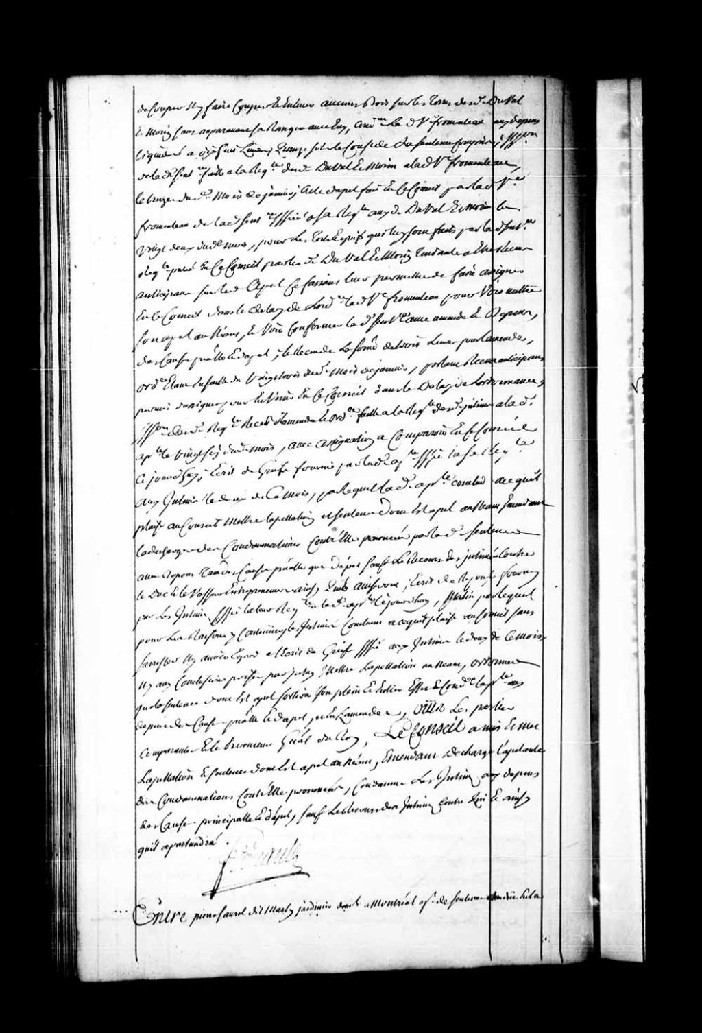 Arrêt qui continue l'audience à lundi prochain auquel jour sera fait droit définitivement, tant en présence qu'absence, dans la cause entre Pierre Saurel dit Marly, jardinier demeurant à Montréal, représenté par maître Panet, notaire royal, son procureur, appelant de la sentence rendue en la Juridiction de Montréal, le 24 juin 1758, contre Pierre Miville, charpentier, représenté par maître Decharnay, 5 mars 1759, Archives nationales à Québec, Fonds Conseil souverain, (03Q,TP1,S28,P21516).