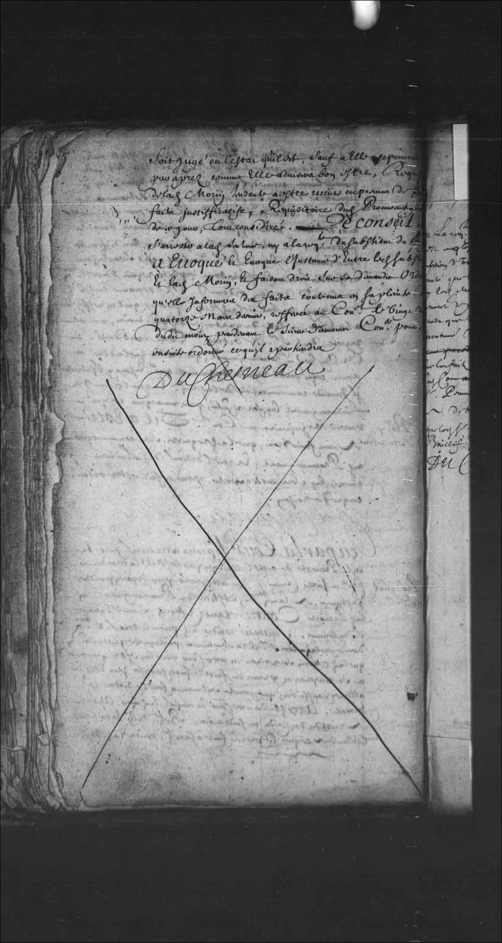 Transcription du texte avec orthographe modernisée : «Du 23e janvier 1679. Vu la requête présentée au Conseil par Christophe Martin contenant que Claude Bailly s'est employé pour maître Jean-Baptiste Peuvret greffier de cette Cour à la réception d'un moulin à scier de la planche, même que ledit sieur Peuvret s'est vanté que ledit Bailly en cela lui avait rendu des services considérables, et que sans lui ledit moulin ne serait point en état de travailler ce qui oblige ledit sieur Peuvret de prendre les intérêts dudit Bailly, requérant que attendu que dans les affaires ou ledit sieur Peuvret est intéressé il n'a pas accoutumé de tenir la plume, il plaise à la Cour commettre tel qu'il lui plaira au lieu dudit sieur Peuvret, pour procéder à l'interrogatoire dudit Bailly sur les faits et articles du suppliant, au bas de laquelle requête ladite Cour aurait ordonné que ledit sieur Peuvret en aurait communication; réponses dudit sieur Peuvret, réplique dudit sieur Martin, tout considéré. La Cour a débouté et déboute ledit Martin des fins de sa dite requête et ordonne que ledit sieur Peuvret continuera de travailler en l'affaire entre lesdits Martin et Bailly. DUCHESNEAU.»