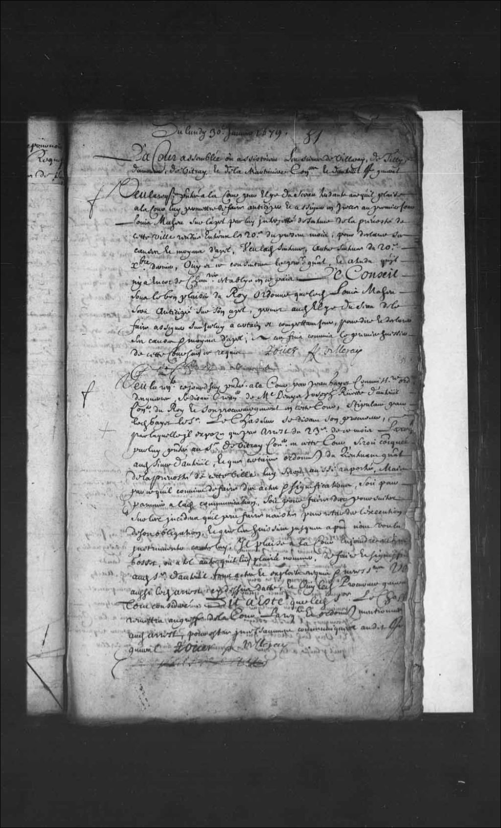 - Transcription du texte avec orthographe modernisée : «Vu la requête ce jourd'hui présentée à la Cour par Jean Gayet commissaire ordinaire des guerres, se disant créancier de maître Denis Joseph Ruette d'Auteuil conseiller du Roi et son procureur général en cette Cour stipulant pour ledit Gayet le sieur LeChasseur se disant son procureur, par laquelle il expose que par arrêt du 23e de ce mois, la requête par lui présentée au sieur de Vitray conseiller en cette Cour, serait communiquée audit sieur d'Auteuil, et que certaine ordonnance du lieutenant général de la prévôté de cette ville lui serait aussi rapportée, mais parce qu'il convient de faire des actes et significations, soit pour parvenir à ladite communication, soit pour faire des poursuites sur les incidents qu'il peut faire naître pour retarder l'exécution de son obligation, et que les huissiers jusqu'à présent n'ont voulu instrumenter contre lui, il plaise à la Cour enjoindre à l'huissier Gosset ou à tel autre qu'il lui plaira nommer de faire et signifier audit sieur d'Auteuil tous actes et exploits requis et nécessaires; vu aussi ledit arrêt ci-dessus daté, et ouï ledit procureur général, tout considéré, dit a été que ledit sieur LeChasseur remettra au greffe de la Cour la requête et ordonnance mentionnées audit arrêt pour être incessamment communiquées audit procureur général. ROUER DE VILLERAY.»