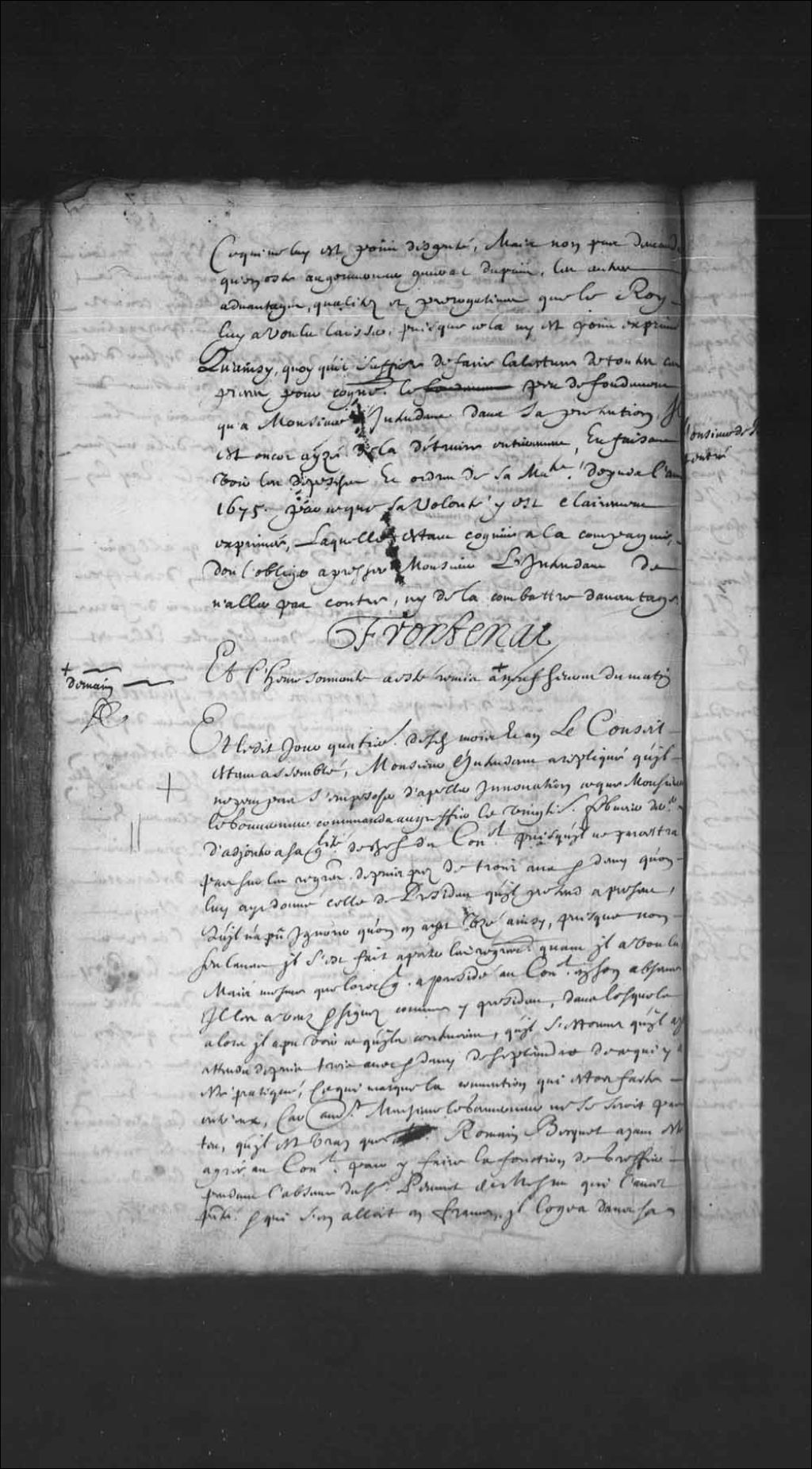 Transcription du texte avec orthographe modernisée : «Et ledit jour quatrième desdits mois et an le Conseil étant assemblée, Monsieur l'intendant a répliqué qu'il ne peut pas s'empêcher d'appeler innovation ce que Monsieur le gouverneur commanda au greffier le vingtième février dernier d'ajouter à sa qualité de chef du Conseil puisqu'il ne paraîtra pas sur les registres depuis plus de trois ans et demi qu'on lui ait donné celle de président qu'il prétend a présent, qu'il n'a pu ignorer qu'on en ait usé ainsi, puisque non seulement il s'est fait apporter les registres quand il a voulu, mais même que lorsqu'il a présidé au Conseil en son absence il les a vus et signés comme y président, dans lesquels alors il a pu voir ce qu'ils contiennent, qu'il se trouve qu'il ait attendu trois ans et demi de se plaindre de ce qui a été pratiqué, ce qui marque la convention qui était faite entre eux, car comment Monsieur le gouverneur ne se serait pas tu, qu'il est vrai que Romain Becquet ayant été agrée au Conseil pour y faire la fonction de greffier pendant l'absence du sieur Peuvret de Mesnu qu'il l'avait présenté et qui s'en allait en France, il logea dans sa maison pendant quatre mois ou environ, et que si Monsieur le gouverneur y eût trouvé à redire il l'eût sensiblement obligé de l'en avertir et qu'il l'eût fait retirer, et qu'il l'aurait mis en état d'éviter le blâme qu'il lui veut prétendre imputer, qu'il ne croit pas néanmoins avoir fait une grande faute en cela, puisque n'étant pas aisé de trouver des gens informés des affaires du pays, il avait besoin à son arrivée d'un homme qui lui pût donner des lumières sur les concessions qui avaient été faites pour exécuter l'ordre qu'il avait de dresser un papier terrier dont il pouvait avoir beaucoup de connaissance exerçant depuis longtemps la charge de notaire royal, qu'il ne lui a jamais commandé de rien faire contre ce qui n'était pratiqué au Conseil par ledit Peuvret de Mesnu ce qu'il est aisé de justifier par le registre n'ayant suivi que ce que ledit Peuvret avait commencé avant son départ, et cela est si vrai que le second jour de la séance que lui intendant fît au Conseil qui fut le vingt-quatre septembre mille six cent soixante quinze ledit Peuvret exerçant sa charge, ce qu'il fît encore jusqu'au vingt-neuf octobre ensuivant, dans l'intitulation lorsqu'il parla de Monsieur le gouverneur, il écrivit messire Louis Buade Frontenac comte de Palluau et gouverneur et lieutenant général pour sa Majesté Etc, et faisant mention de lui intendant maître Jacques Duchesneau chevalier et intendant Etc, et le jour du Conseil ensuivant, on écrivit ainsi que Monsieur le gouverneur et lui en étaient convenus, Monsieur le gouverneur président du Conseil, l'intendant faisant fonction de président suivant la déclaration du Roi, ce qui fut suivi le sept octobre. Le huitième dudit mois ledit Peuvret de Mesnu se contenta d'écrire seulement Messieurs le gouverneur et intendant, ce qu'il pratiqua le vingt et un et le vingt-neuf du même mois, puis partit pour France. Ledit Becquet qui entra en fonction le vingt-cinquième novembre continua de la même manière, jusqu'au troisième février mille six cent soixante-seize qu'il mit Monsieur le gouverneur simplement et ajouta à la qualité d'intendant faisant les fonctions de président, ce qu'il discontinua dès le vingt-quatre ensuivant, et recommença le seizième jour de mars, et cessa encore peu de temps après, et ne donna que la qualité de gouverneur et d'intendant, ce qui fut suivi par Roger commis en l'absence de Becquet, lequel Becquet étant de retour, continua de la même manière, jusqu'au cinquième d'octobre mille mille six cent soixante-dix-sept que ledit Peuvret de Mesnu étant arrivé de France fit la fonction qui en usa de la même sorte qu'il avait fait avant son départ jusqu'au huit novembre de ladite année que Monsieur le gouverneur étant absent du Conseil, il mit ou présidait Monsieur l'intendant, ce qu'il changea le jour du Conseil ensuite, et ne donna aucune qualité, et le septième de mars mille six cent soixante-dix-huit Monsieur le gouverneur ayant voulu présider en son absence, il mit où Monsieur le gouverneur présidait, et dans la suite ordinairement il n'a donné aucune qualité, et quelquefois aussi il a fait mention que l'intendant présidait, et l'a qualifié une fois seulement président du Conseil, jusqu'au sixième février dernier, qu'il donna à Monsieur le gouverneur la qualité de chef du Conseil, et qu'il ajouta à son titre d'intendant, faisant fonction de président suivant la déclaration du Roi; et le vingtième dudit mois, Monsieur le gouverneur comme il a déjà été dit lui commanda d'ajouter à sa qualité de chef dudit Conseil celle de président et à la sienne d'intendant, faisant aussi fonction de président suivant la déclaration du Roi, ce qui a donné sujet à cette contestation. Ajoute encore qu'il a remarqué par les anciens registres que quelquefois les greffiers n'ont pas toujours usé des même termes dans les intitulations. Du temps que Monsieur de Mesy était gouverneur, ils ont écrit où était Monsieur le gouverneur, lorsque Monsieur de Tracy qui faisait les fonctions de vice-roi vint en ce pays avec Monsieur de Courcelles gouverneur, d'abord on écrivit ou présidait Monseigneur de Tracy, et où était Monsieur le gouverneur, ensuite ou présidait Monsieur Alexandre de Prouville, chevalier seigneur de Tracy Etc, et où étaient présents messire Daniel de Rémy chevalier seigneur de Courcelle, gouverneur. Après le départ de Monsieur de Tracy, le greffier faisant mention de ceux qui assistaient au Conseil, le faisait en ces termes, ou présidait messire Daniel de Rémy Etc, Monsieur le comte de Frontenac lui ayant succédé, le greffier s'expliqua de deux manières, tantôt ou présidait haut et puissant seigneur messire Louis de Buade etc. et quelquefois ou présid