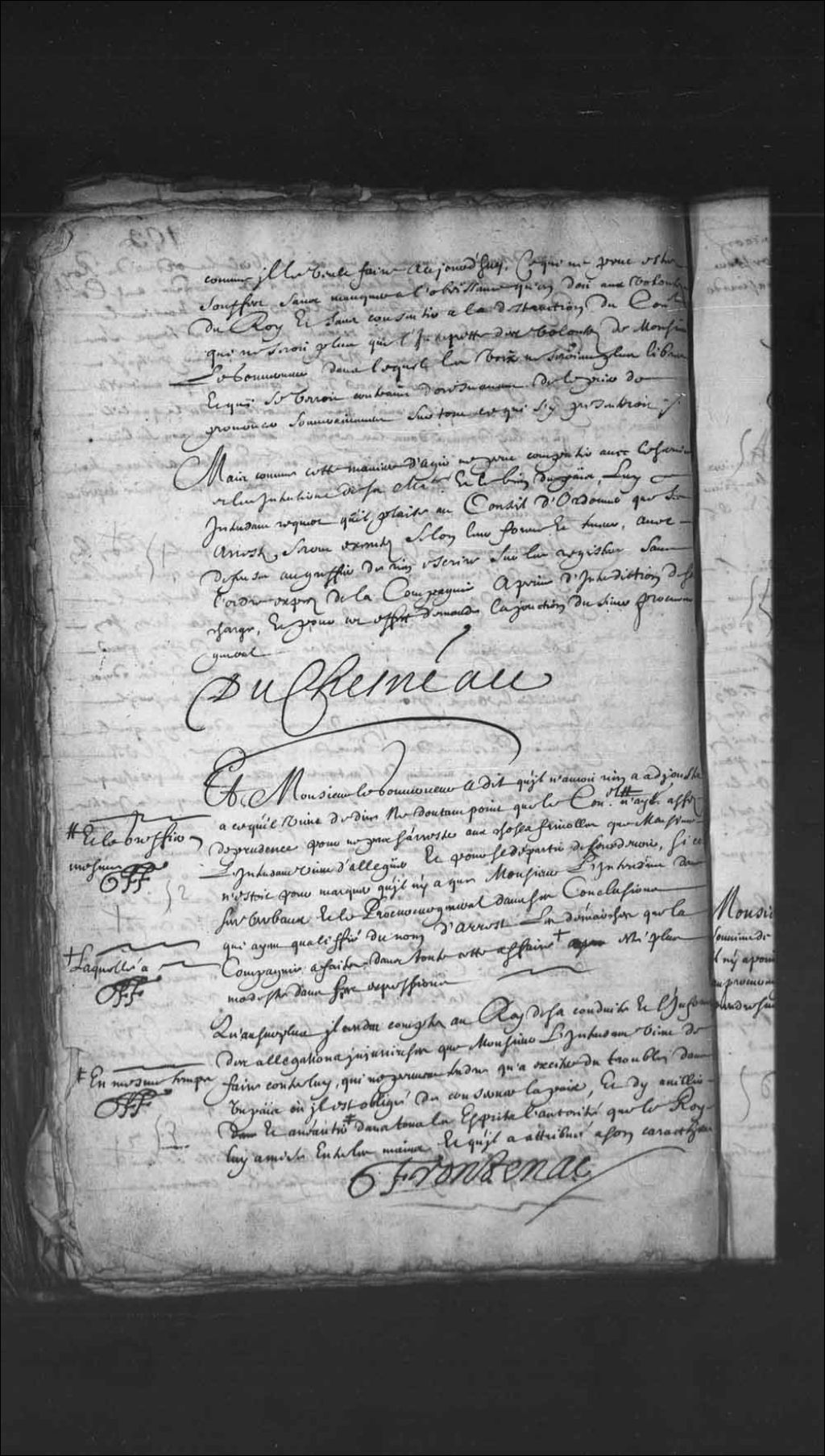 Transcription du texte avec orthographe modernisée : «Et Monsieur le gouverneur a dit qu'il n'avait rien à ajouter à ce qu'il vient de dire ne doutant point que le Conseil et le greffier même n'ait assez de prudence pour ne pas s'arrêter aux choses frivoles que Monsieur l'intendant vient à alléguer et pour se départir de son devoir, si ce n'était pour marquer qu'il n'y a que Monsieur l'intendant dans ses verbaux et le procureur général dans ses conclusions qui aient qualifié du nom d'arrêt les démarches que la compagnie a faites dans toute cette affaire laquelle a été plus modeste dans ses expressions. Qu'au surplus il rendra compte au Roi de sa conduite et l'informera des allégations injurieuses que Monsieur l'intendant vient de faire contre lui qui ne peuvent tendre qu'à exciter du trouble dans un pays où il est obligé de conserver la paix, et d'y avilir et anéantir en même temps dans tous les esprits l'autorité que le Roi lui a mises entre les mains, et qu'il a attribuée à son caractère. FRONTENAC Monsieur le procureur général demande communication des dires de Monsieur le gouverneur et de Monsieur l'intendant pour en venir à mercredi prochain à l'heure ordinaire. TEUIL Monsieur de la Martinière est d'avis que Monsieur le procureur général prenne communication des dires de Monsieur le gouverneur et de Monsieur l'intendant pour en venir au prochain jour plaidable d'après Quasimodo. C. DE BERMEN Monsieur de Vitré est d'avis que Monsieur le procureur général prenne communication, pour en venir à mardi comme il l'a dit. C. DE VITRÉ. Monsieur Damours est de l'avis de Monsieur de la Martinière, à cause des fêtes. DAMOURS Monsieur de Tilly est du même avis. LEGARDEUR DE TILLY Monsieur de Villeray de même avis. ROUER DE VILLERAY Monsieur de Bernières de même avis. H. DE BERNIERES Monsieur le gouverneur que si on se souvient de ce qu'il a dit au nom du Roi il n'y a point d'autre communication à donner au procureur général que celle qu'il peut prendre sur le champ. FRONTENAC.»