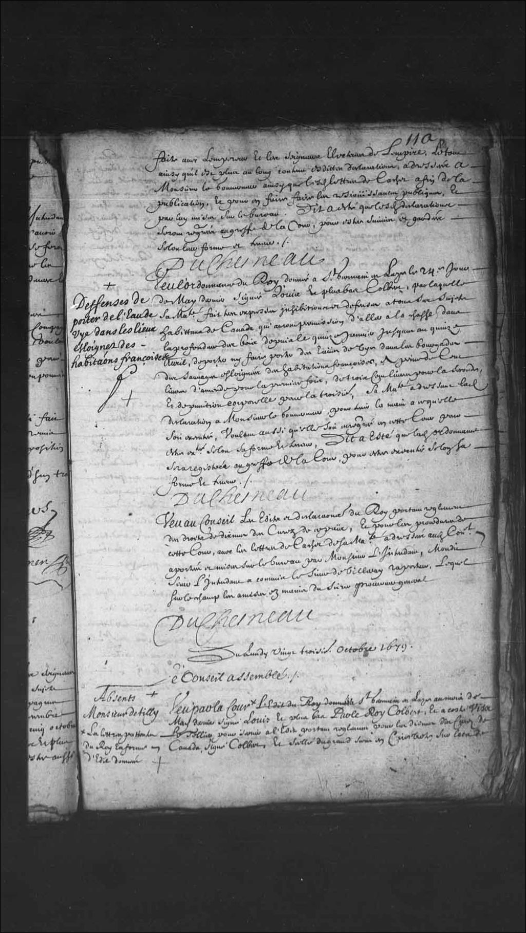 Transcription du texte avec orthographe modernisée : «Vu l'ordonnance du Roi donnée à Saint-Germain en Laie le 24e jour de mai dernier signée Louis et plus bas Colbert, par laquelle sa Majesté fait très expresses inhibitions et défenses à tous ses sujets habitants du Canada qui auront permission d'aller à la chasse dans la profondeur des bois depuis le quinze janvier jusqu'au quinze avril, de porter ni faire porter des eaux-de-vie dans les bourgades des Sauvages éloignées des habitations françaises, à peine de cent livres d'amende pour la première fois, de trois cents livres pour la seconde, et de punition corporelle pour la troisième, sa Majesté adressant ladite déclaration à Monsieur le gouverneur pour tenir la main à ce qu'elle soit exécutée, voulant aussi qu'elle soit enregistrée en cette Cour pour être exécutée selon sa forme et teneur. Dit a été que ladite ordonnance sera registrée au greffe de la Cour pour être exécutée selon sa forme et teneur. DUCHESNEAU.»