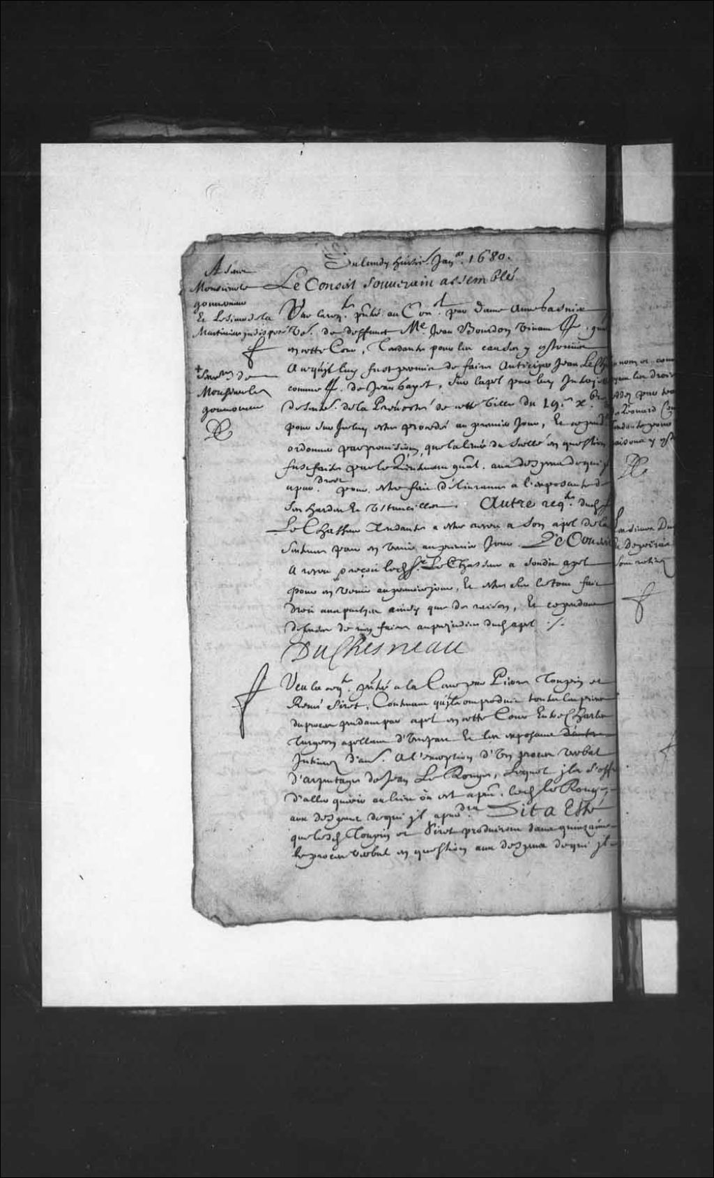 Arrêt ordonnant à Pierre Toupin et René Siret de produire dans la quinzaine le procès verbal d'arpentage de Jean Lerouge, arpenteur, dans la cause pendante en appel entre eux et Charles Turgeon, 8 janvier 1680, Archives nationales à Québec, Fonds Conseil souverain, (03Q,TP1,S28,P2271).