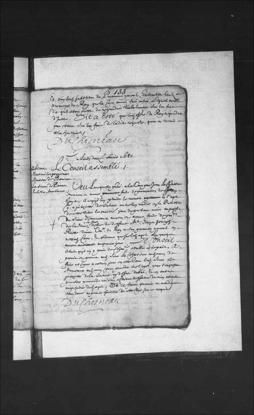 Transcription du texte avec orthographe modernisée : «Du lundi douzième février 1680. Le Conseil assemblé. Absents. Monsieur le gouverneur Monsieur de Bernières les sieurs Depeiras et de la Martinière. Vu la requête présentée à la Cour par Jean LeChasseur au nom et comme fondé de procuration de Jean Gayet, à ce qu'il lui plaise le recevoir en l'appel qu'il a interjeté de sentence contre lui rendue en la prévôté de cette ville le troisième jour du présent mois au profit du sieur de Monceaux au nom et comme fondé de procuration de la dame sa mère veuve de défunt maître Denis Joseph Ruette vivant conseiller du Roi et son procureur général en cette Cour, et ordonner que sur ledit appel les parties auront audience au premier jour. Le Conseil attendu qu'il n'y a point de chancellerie établie en ce pays, a permis et permet audit sieur LeChasseur audit nom de faire assigner à certain jour en cette Cour ledit sieur de Monceaux audit nom, pour procéder sur l'appel par l'exposant interjeté de la sentence ci-dessus datée, et en outre procéder comme de raison, faisant défenses de rien attenter au préjudice dudit appel, de ce faire pouvoir et mandement étant donné au premier huissier de cette Cour sur ce requis. DUCHESNEAU.»