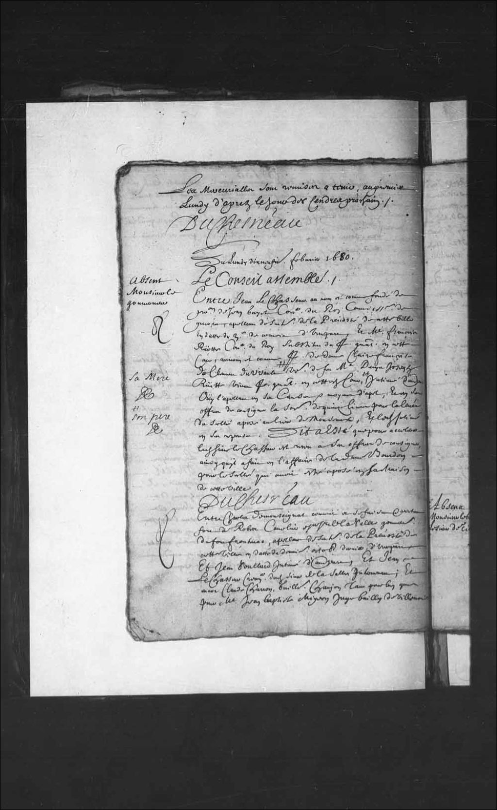 - Transcription du texte avec orthographe modernisée : «Du lundi dix-neuvième février 1680. Le Conseil assemblé. Absent. Monsieur le gouverneur. Entre Jean LECHASSEUR au nom et comme fondé de procuration de Jean Gayet conseiller du Roi commissaire de guerres, appelant de sentence de la prévôté de cette ville en date du 3e de ce mois d'une part, et maître François RUETTE conseiller du Roi substitut du procureur général en cette Cour, au nom et comme procureur de dame Claire Françoise du Clément Duvault sa mère veuve de feu maître Denis Joseph Ruette vivant procureur général en cette Cour son père, intimé d'autre part ouï l'appelant en ses causes et moyens d'appel, et en ses offres de consigner la somme de quinze livres pour la levée du scellé apposé au lieu de Monseaux, et ledit intimé en ses réponses. Dit a été que pour accélérer ledit sieur LeChasseur est reçu à ses offres de consigner ainsi qu'il a fait en l'affaire de la dame Bourdon pour le scellé qui avait été apposé en sa maison de cette ville. DUCHESNEAU.»