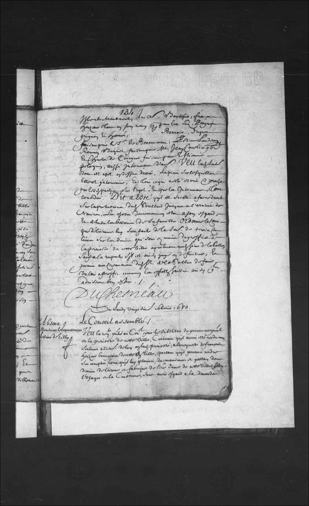- Transcription du texte avec orthographe modernisée : «Du lundi vingt-sixième février 1680. Le Conseil assemblé. Absents. Monsieur le gouverneur, le sieur de Tilly. Vu la requête présentée au Conseil par le substitut du procureur général en la prévôté de cette ville, contenant qu'il aurait été rendu sentence à l'encontre de lui en ladite prévôté, à la requête de François Hazeur bourgeois de cette ville, portant qu'il pourrait rendre ses comptes, lorsqu'il lui plairait, du maniement et gestion des deniers de l'oeuvre et fabrique de Notre-Dame de cette ville, selon l'usage et la coutume sans avoir égard à la demande qu'avait faite ledit substitut dans son plaidoyé du douze janvier dernier et qu'il déduira en temps et lieu, comme aussi les torts et griefs qui lui sont faits par ladite sentence, pourquoi il se serait porté appelant, en s'opposant à la reddition desdits comptes, jusqu'audit appel vidé, pourquoi il supplie la Cour le recevoir à sondit appel, dit a été, attendu qu'il n'y a point de chancellerie en ce pays, que la Cour a permis et permet audit substitut, de faire assigner à certain jour en icelle ledit Hazeur et autres qu'il avisera bon être, pour procéder sur ledit appel, faisant défenses de rien attenter au préjudice d'icelui, de ce faire pouvoir et mandement étant donné au premier huissier de cette Cour sur ce requis. DUCHESNEAU.»