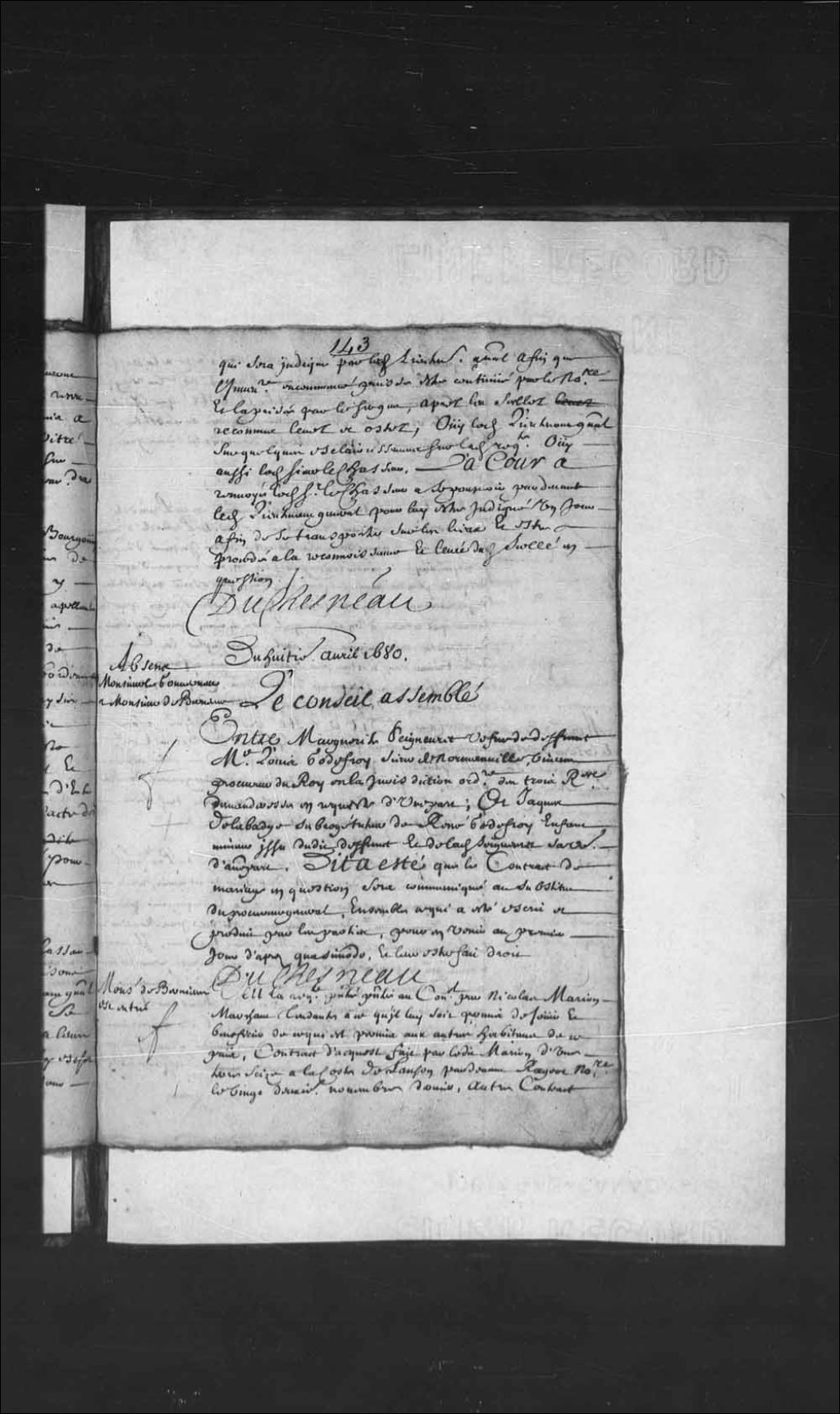 - Transcription du texte avec orthographe modernisée : «Monsieur de Bernières est entré. Vu la requête présentée au Conseil par Nicolas Marion marchand tendante à ce qu'il lui soit permis de jouir et bénéficier de ce qui est permis aux autres habitants de ce pays, contrat d'acquêt fait par ledit Marion d'une terre sise à la côte de Lauson par-devant Rageot notaire le vingt-deuxième novembre dernier, autre contrat d'acquêt par lui fait d'une maison sise à la basse-ville de Québec passé par-devant Duquet notaire le vingt-neuvième mars dernier. Dit a été que lesdites requêtes et pièces seront communiquées au substitut du procureur général, pour être sur ses conclusions faits droit. DUCHESNEAU.»