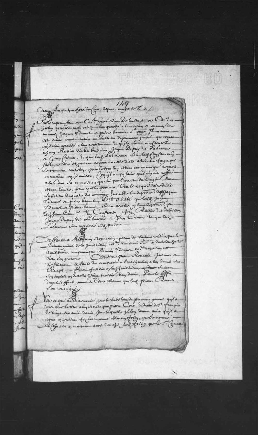 Arrêt ordonnant que Jacques Brunel et Pierre Gareau Saint-Onge soient recollés en leur déposition par le sieur de la Martinière, conseiller et commissaire, et confronté à Jean Ratier dit Dubuisson, Jacques Dupuis dit Lagarenne et Jean Crevier; et que ledit Lagarenne sera détenu dans les prisons royales de Québec, 8 juillet 1680, Archives nationales à Québec, Fonds Conseil souverain, (03Q,TP1,S28,P2340).