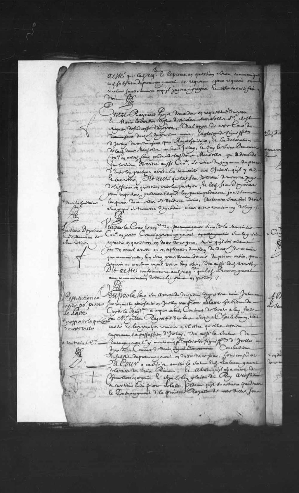 - Transcription du texte avec orthographe modernisée : «Restitution en entier pour Pierre Le Latte. Vu par la Cour son arrêt du douzième du présent mois intervenu sur requête présentée en icelle par Pierre Lelatte habitant du Cap de la Madeleine, à ce que certain contrat de vente à lui faite par maître Gilles Rageot greffier de la prévôté de cette ville d'une terre sise à Charlesbourg soit cassé et les parties remises en tel état qu'elles étaient auparavant la passation d'icelui, vu aussi la sentence du lieutenant général des Trois-Rivières y mentionnée, et l'exploit de signification d'icelle, copie dudit contrat de vente, conclusions du substitut du procureur général en date de ce jour, tout considéré. La Cour a cassé et annulé la sentence dudit lieutenant général de la ville des Trois-Rivières; et attendu qu'il n'y a encore de chancellerie en ce pays et sous le bon plaisir du Roi a restitué et restitue ledit Pierre Lelatte, ordonne qu [...]