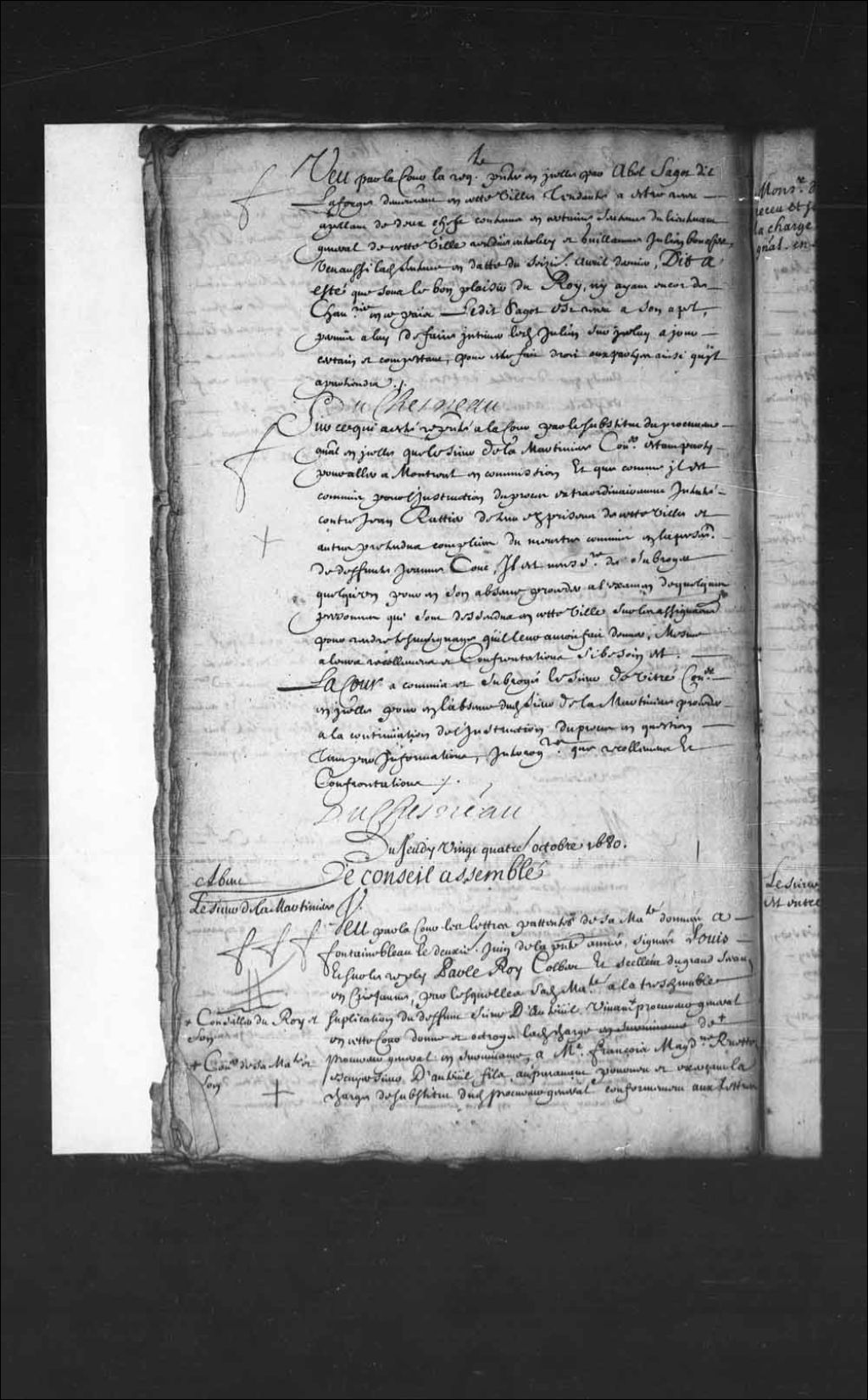 - Transcription du texte avec orthographe modernisée : «Sur ce qui a été représenté à la Cour par le substitut du procureur général en icelle que le sieur de La Martinière conseiller étant parti pour aller à Montréal en commission et que comme il est commis pour l'instruction du procès extraordinairement intenté contre Jean Rattier détenu des prisons de cette ville et autres prétendus complices du meurtre commis en la personne de défunte Jeanne Couc, il est nécessaire de subroger quelqu'un pour en son absence procéder à l'examen de quelques personnes qui sont descendus en cette ville sur les assignations pour rendre témoignage qu'il leur aurait fait donner, même à leurs récolements et confrontations si besoin est. La Cour a commis et subrogé le sieur de Vitré conseiller en icelle pour en l'absence dudit sieur de La Martinière procéder à la continuation de l'instruction du procès en question tant par informations, interrogatoires que récolements et confrontations. DUCHESNEAU.»