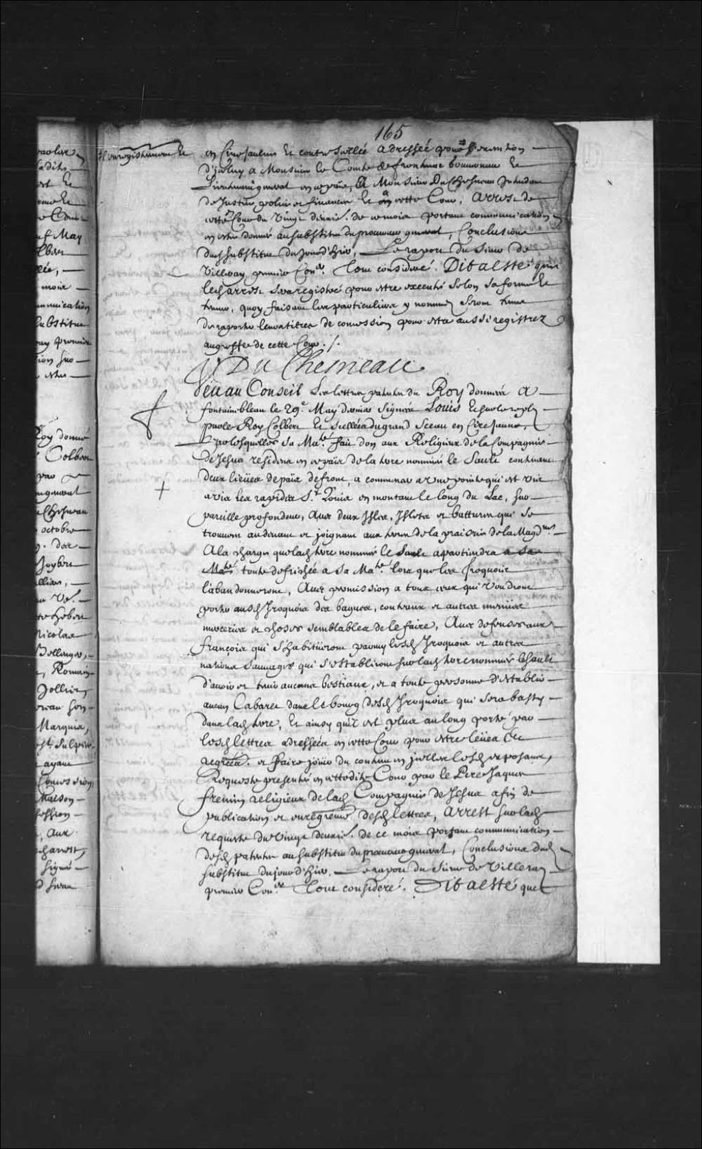 - Transcription du texte avec orthographe modernisée : «Vu au Conseil les lettres patentes du Roi données à Fontainebleau le 29e mai dernier signées Louis et sur le repli par le Roi Colbert et scellées du grand sceau en cire jaune, par lesquelles sa Majesté fait don aux religieux de la compagnie de Jésus résidant en ce pays de la terre nommée le Sault contenant deux lieues de pays de front, à commencer à une pointe qui est vis-à-vis les rapides sieur Louis en montant le long du Lac, sur pareille profondeur, avec deux îles, islets et battures qui se trouvent au-devant et joignant aux terres de La Prairie de la Madeleine à la charge que ladite terre nommée le Sault appartiendra toute défrichée à sa Majesté lors que les Iroquois l'abandonneront, avec permission à tous ceux qui voudront porter auxdits Iroquois des bagues, couteaux et autres menues merceries et choses semblables de le faire, avec défenses aux Français qui s'habitueront parmi [...]