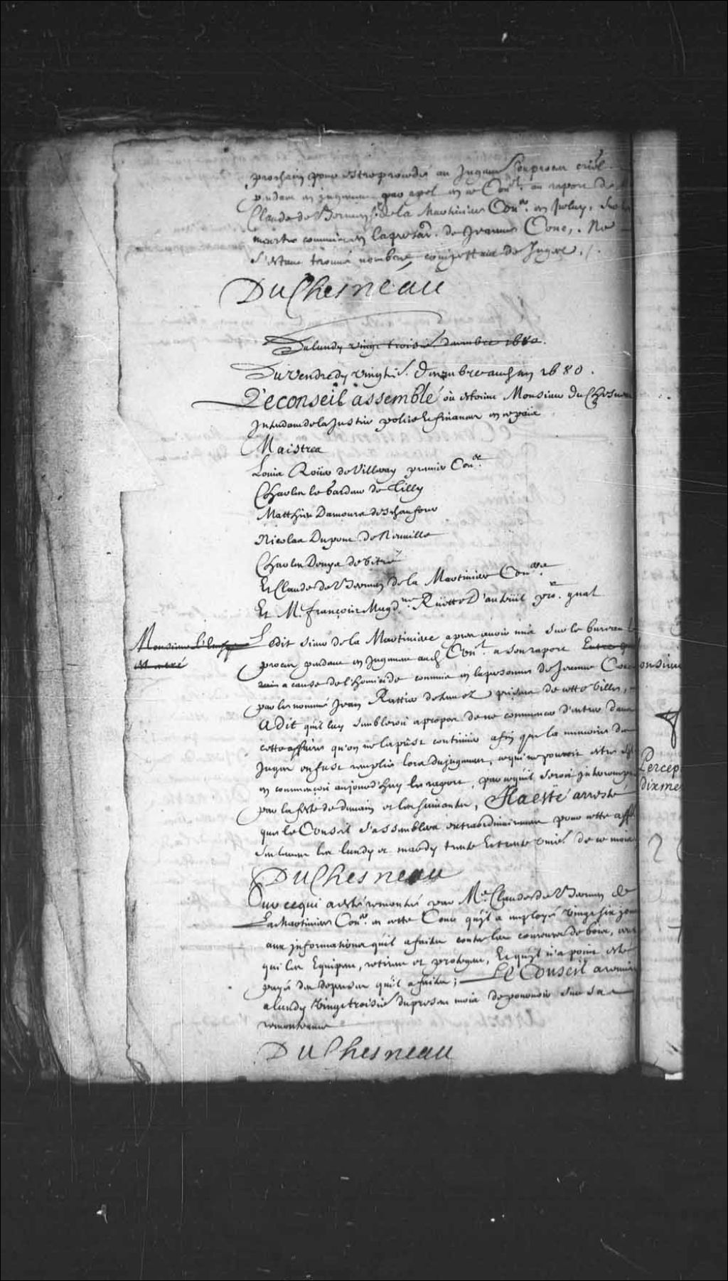 - Transcription du texte avec orthographe modernisée : «Du vendredi vingtième décembre audit an 1680. Le Conseil assemblé où étaient Monsieur Duchesneau intendant de la justice police et finances en ce pays. Maîtres. Louis Rouer de Villeray premier conseiller. Charles Legardeur de Tilly. Mathieu Damours Deschaufour. Nicolas Dupont de Neuville. Charles Denys de Vitré. Et Claude de Bermen de la Martinière conseillers. Et maître François Madeleine Ruette d'Auteuil procureur général. Ledit sieur de La Martinière après avoir mis sur le bureau le procès pendant en jugement audit Conseil à son rapport à cause de l'homicide commis en la personne de Jeanne Couc par le nommé Jean Rattier détenu des prisons de cette ville a dit qu'il lui semblerait à propos de ne commencer d'entrer dans cette affaire qu'on ne la pût continuer afin que la mémoire des juges en fut remplie lors du jugement, ce qui ne pourrait être s'il en commençait aujourd'hui le rapport, parce qu'il serait interrompu par la fête de demain et les suivantes, il a été arrêté que le Conseil s'assemblera extraordinairement pour cette affaire seulement les lundi et mardi trente et trente et unième de ce mois. DUCHESNEAU.»