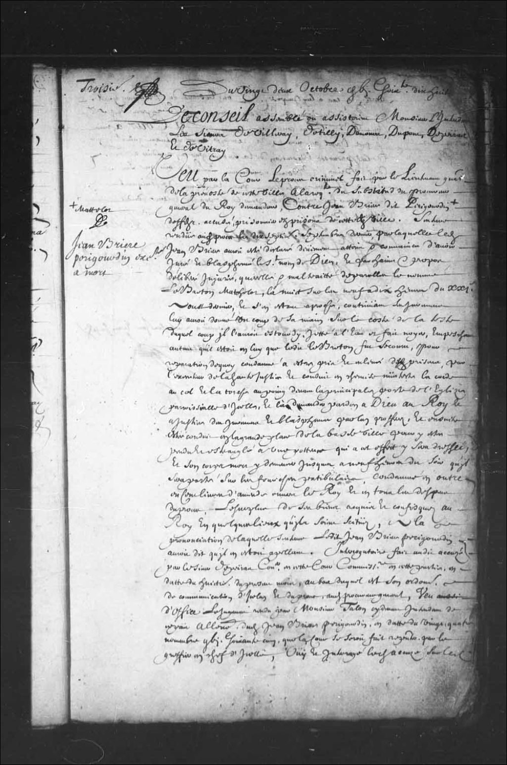 Transcription du texte avec orthographe modernisée : «Du vingt-deux octobre mille six cent soixante-dix-huit. Le Conseil assemblé où assistaient Monsieur l'intendant, les sieurs de Villeray, de Tilly, Damours, Dupont, Depeiras et de Vitray. Jean Brière perigourdin exécution à mort. Vu par la Cour le procès criminel fait par le lieutenant général de la prévôté de cette ville à la requête du substitut du procureur général du Roi demandeur, contre Jean Brière dit Perigourdin matelot défendeur accusé, prisonnier des prisons de cette ville. Sentence rendue audit procès le dix-septième septembre dernier, par laquelle ledit Jean Brière aurait été déclaré dûment atteint et convaincu d'avoir juré et blasphémé le saint nom de Dieu, et par haine et propos délibéré injurié, querellé et maltraité de paroles le nommé le Breton matelot, la nuit sur les neuf à dix heures du 21e août dernier, et s'en étant approché, continuant ses jurements lui aurait [...]