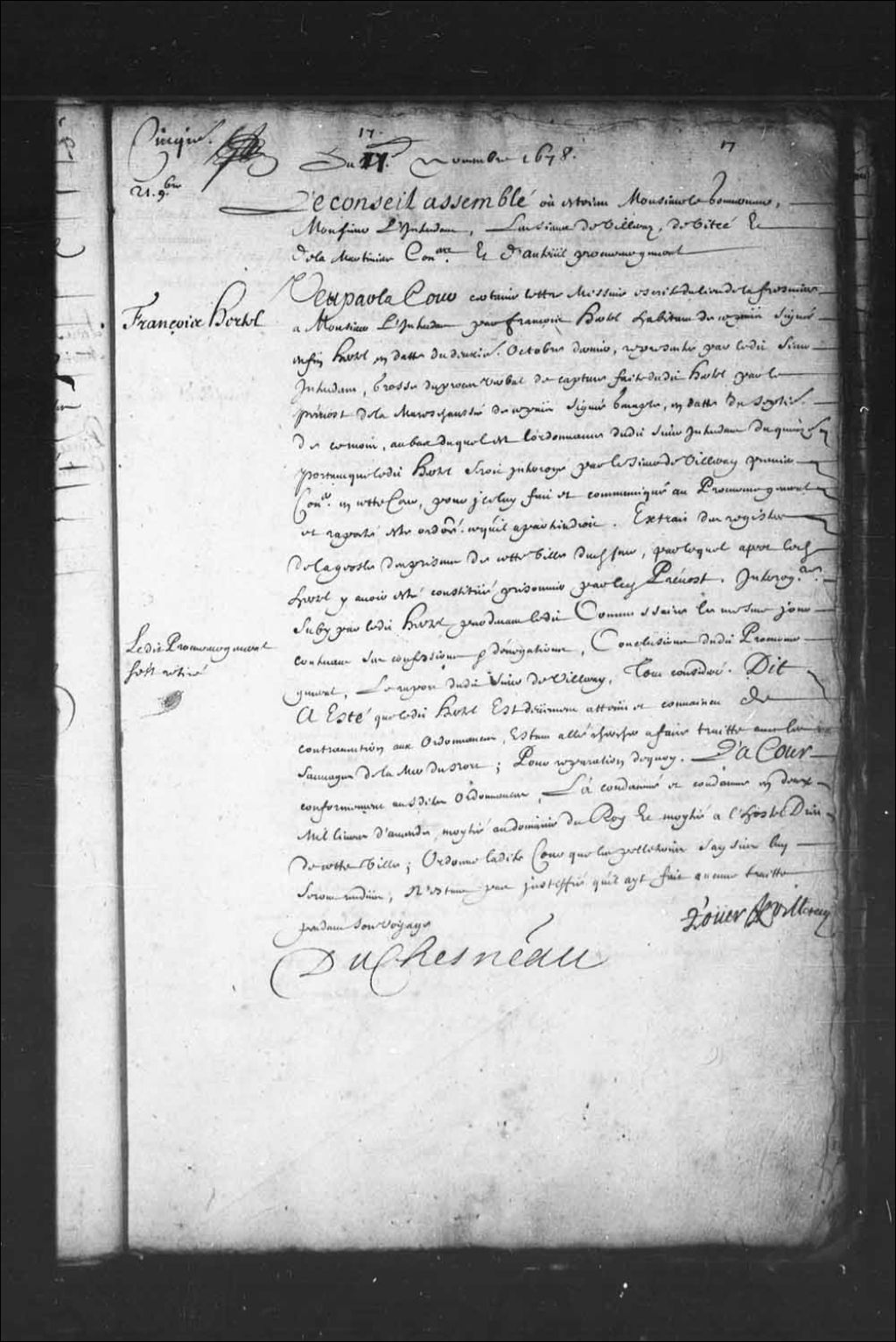Transcription du texte avec orthographe modernisée : «Du 17e novembre 1678. Le Conseil assemblé où étaient Monsieur le gouverneur, Monsieur l'intendant, les sieurs de Villeray, de Vitré et de la Martinière conseillers et d'Auteuil procureur général. François Hertel. Vu par la Cour certaine lettre missive écrite du lieu de la Fresnière à Monsieur l'intendant par François Hertel habitant de ce pays signée en fin Hertel en date du deuxième octobre dernier, représentée par ledit sieur intendant, grosse du procès-verbal de capture faite dudit Hertel par le prévôt de la maréchaussée de ce pays signée Genaple, en date du septième de ce mois, au bas duquel est l'ordonnance dudit sieur intendant du quinzième portant que ledit Hertel serait interrogé par le sieur de Villeray premier conseiller en cette Cour, pour icelui fait et communiqué au procureur général et rapporté être ordonné ce qu'il appartiendrait. extrait des registres de la geôle des [...]