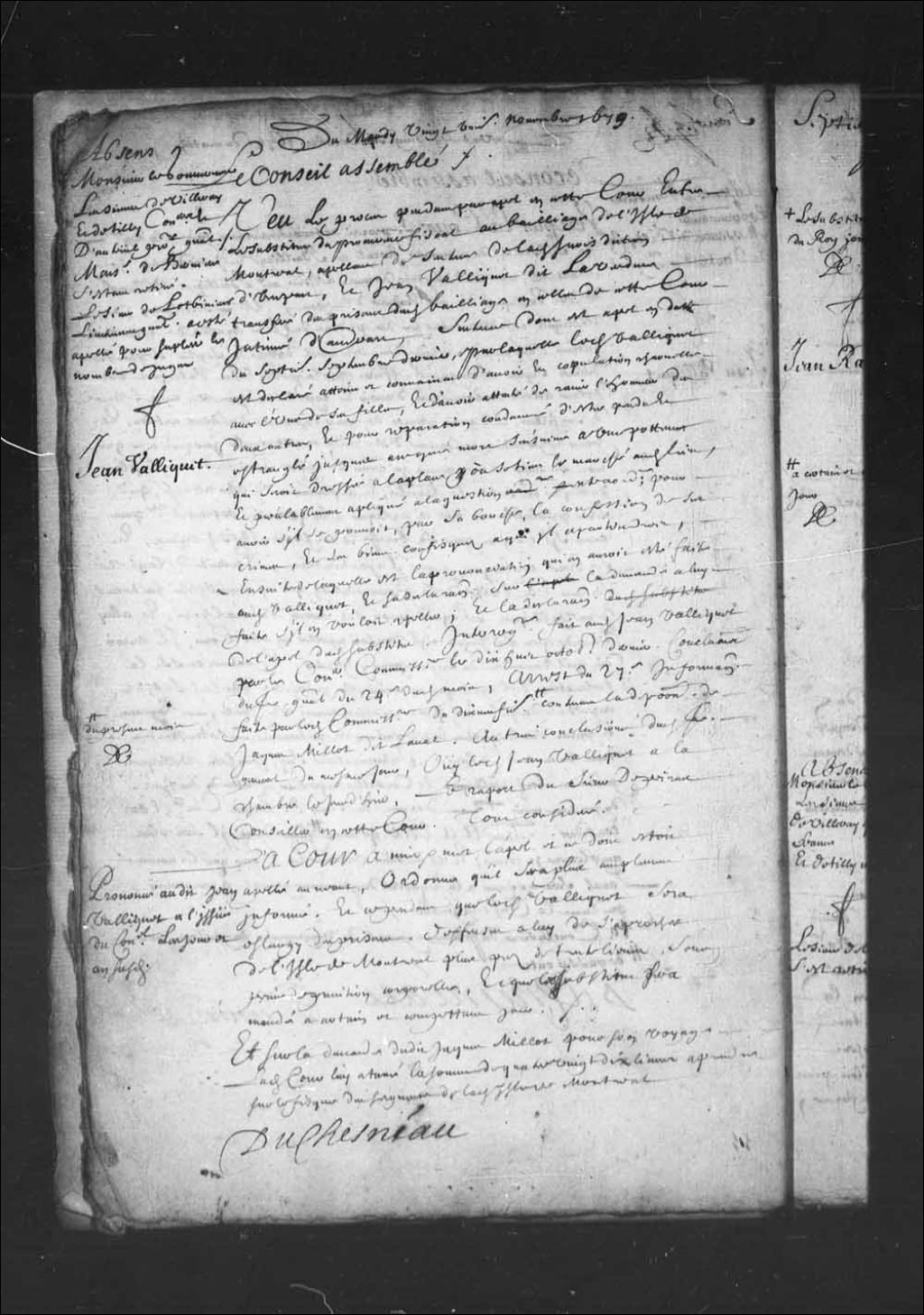 - Transcription du texte avec orthographe modernisée : «Du mardi vingt et unième novembre 1679. Le Conseil assemblé. Absents. Monsieur le gouverneur les sieurs de Villeray et de Tilly conseillers et d'Auteuil procureur général Monsieur de Bernières s'étant retiré. Le sieur de Lotbinière lieutenant général a été appelé pour suppléer le nombre de juges. Vu le procès pendant par appel en cette Cour entre le substitut du procureur fiscal au bailliage de l'île de Montréal, appelant de sentence de ladite juridiction d'une part, et Jean VALLIQUET dit LaVerdure transféré des prisons dudit bailliage en celles de cette Cour intimé d'autre part, sentence dont est appel en date du septième septembre dernier, par laquelle ledit Valliquet est déclaré atteint et convaincu d'avoir eu copulation charnelle avec l'une de ses filles; et d'avoir attenté de ravir l'honneur des deux autres, et pour réparation condamné d'être pendu et étranglé jusqu'à ce que mort s'ensuive à une potence qui serait dressée à la place ou se tient le marché audit lieu, et préalablement appliqué à la question extraordinaire pour avoir s'il se pouvait, par sa bouche, la confession de ses crimes, et ses biens confisqués à qui il appartiendrait, ensuite de laquelle est la prononciation qui en aurait été faite audit Valliquet, et sa déclaration sur la demande à lui faite s'il en voulait appeler; et la déclaration de l'appel dudit substitut, interrogatoire fait audit Jean Valliquet par le conseiller commissaire le dix-huit octobre dernier. Conclusions du procureur général du 24e dudit mois, arrêt du 27e information faite par ledit commissaire du dix-neuvième du présent mois contenant la déposition de Jacques Millot dit Laval. Autres conclusions dudit procureur général du même jour, ouï ledit Jean Valliquet à la chambre le jourd'hier, le rapport du sieur Depeiras conseiller en cette Cour. Tout considéré. Prononcé audit Jean Valliquet à l'issue du conseil les jour et an susdits. La Cour a mis et met l'appel et ce dont était appelé au néant, ordonne qu'il sera plus amplement informé. Et cependant que ledit Valliquet sera élargi des prisons défenses à lui de s'approcher de l'île de Montréal plus près de trente lieues, sous peine de punition corporelle, et que le substitut sera mandé à certain et compétent jour. Et sur la demande dudit Jacques Millot pour son voyage ladite Cour lui a taxé la somme de quatre-vingt-dix livres à prendre sur le fisc des seigneurs de ladite île de Montréal. DUCHESNEAU.»