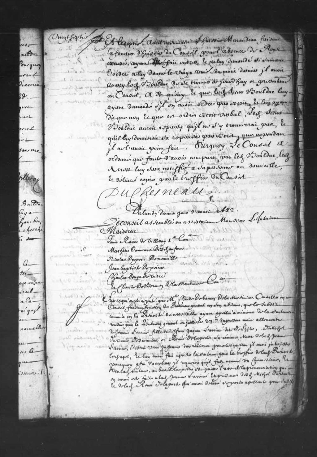 Transcription du texte avec orthographe modernisée : «Et le septième avril ensuivant l'huissier Marandeau faisant la fonction d'huissier du Conseil pour l'absence de Roger excusé, ayant été fait entrer, et à lui demandé si suivant l'ordre à lui donné le vingt et unième du mois dernier il avait averti ledit Boulduc (Bolduc) de se trouver ce jourd'hui et présentement au Conseil, a dit qu'oui, et que ledit sieur Boulduc lui ayant demandé s'il en avait ordre par écrit, et lui ayant dit que non et que cet ordre était verbal, ledit sieur Boulduc aurait réparti qu'il ne s'y trouverait pas, et qu'il lui donnerait sa réponse par écrit, que cependant il ne l'avait point fait. Sur quoi le Conseil a ordonné que faute d'avoir comparu par ledit Boulduc, ledit arrêt lui sera notifié à sa personne ou domicile, et délivré copie par le greffier du Conseil. DUCHESNEAU.»