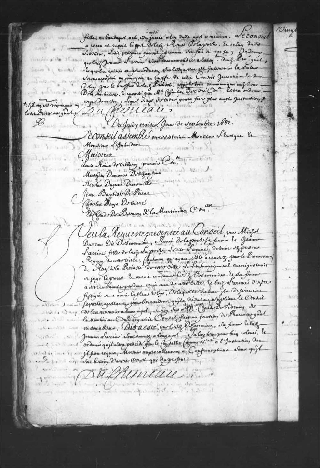 - Transcription du texte avec orthographe modernisée : «Du jeudi troisième jour de septembre 1682. Le Conseil assemblé où assistaient Monsieur l'évêque et Monsieur l'intendant. Maîtres. Louis Rouer de Villeray premier conseiller. Mathieu Damours Deschaufour. Nicolas Dupont de Neuville. Jean-Baptiste DePeiras. Charles Denys de Vitré. Et Claude de Bermen de la Martinière conseillers. Vu la requête présentée au Conseil par Michel Duvau dit Descormiers, Renée de Laporte sa femme et Jeanne L'Arrivé (Arrivé, Larrivé) fille de ladite Laporte, ladite L'Arrivé détenue des prisons royaux de cette ville, contenant qu'ayant été accusés par le procureur du Roi de la prévôté de cette ville le lieutenant général aurait instruit et jugé le procès et aurait condamné lesdits descormiers et sa femme à être bannis pendant trois ans de cette ville, et ladite L'Arrivé d'être fustigée et à avoir la fleur de lys, de laquelle sentence ils désireraient se porter [...]