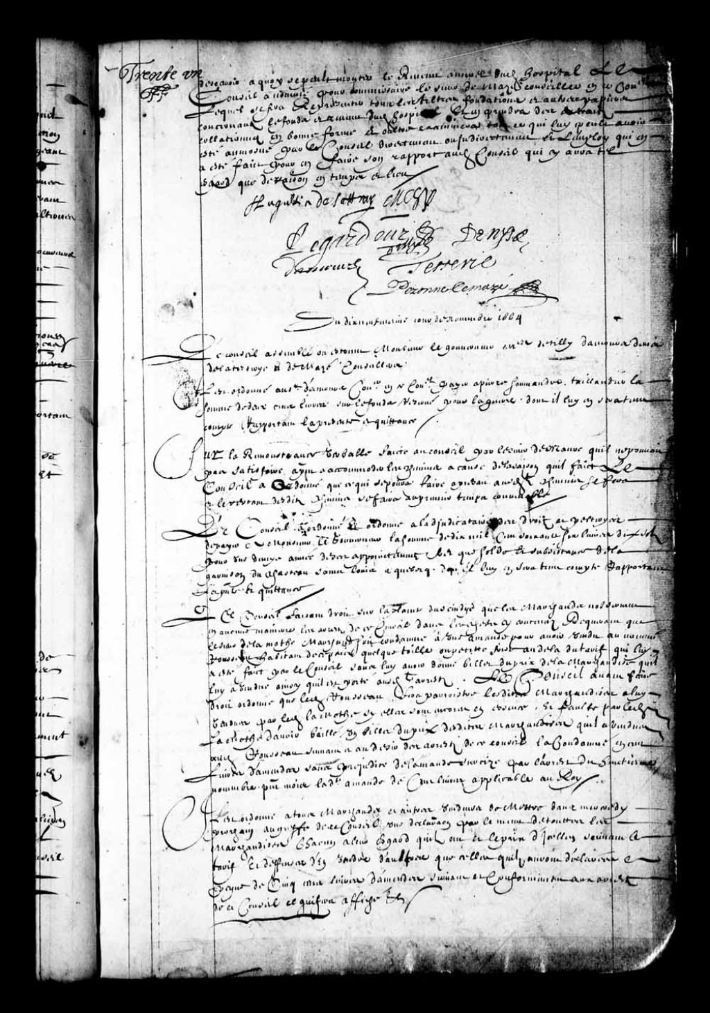 Transcription du texte avec orthographe modernisée : «Le Conseil faisant droit sur la plainte du syndic que les marchands n'observent en aucune manière les arrêts de ce Conseil dans les choses y contenus requérant que le sieur de LaMothe marchand soit condamné à une amende pour avoir vendu au nommé Rousseau habitant de ce pays quelque toile ou petite frise au delà du tarif qui lui a été fait par le Conseil sans lui avoir donné billet du prix de la marchandise qu'il lui a vendue ainsi qu'il est porté auxdits arrêts. Le Conseil avant faire droit ordonne que ledit Rousseau fera paraître lesdites marchandises à lui vendues par ledit LaMothe si elles sont encore en essence, et faute par ledit LaMothe d'avoir baillé un billet du prix desdites marchandises qu'il a a vendues audit Rousseau suivant et au désir des arrêts de ce conseil la condamné en cents livres d'amende sans préjudice de l'amende sursise par l'arrêt du huitième novembre présent