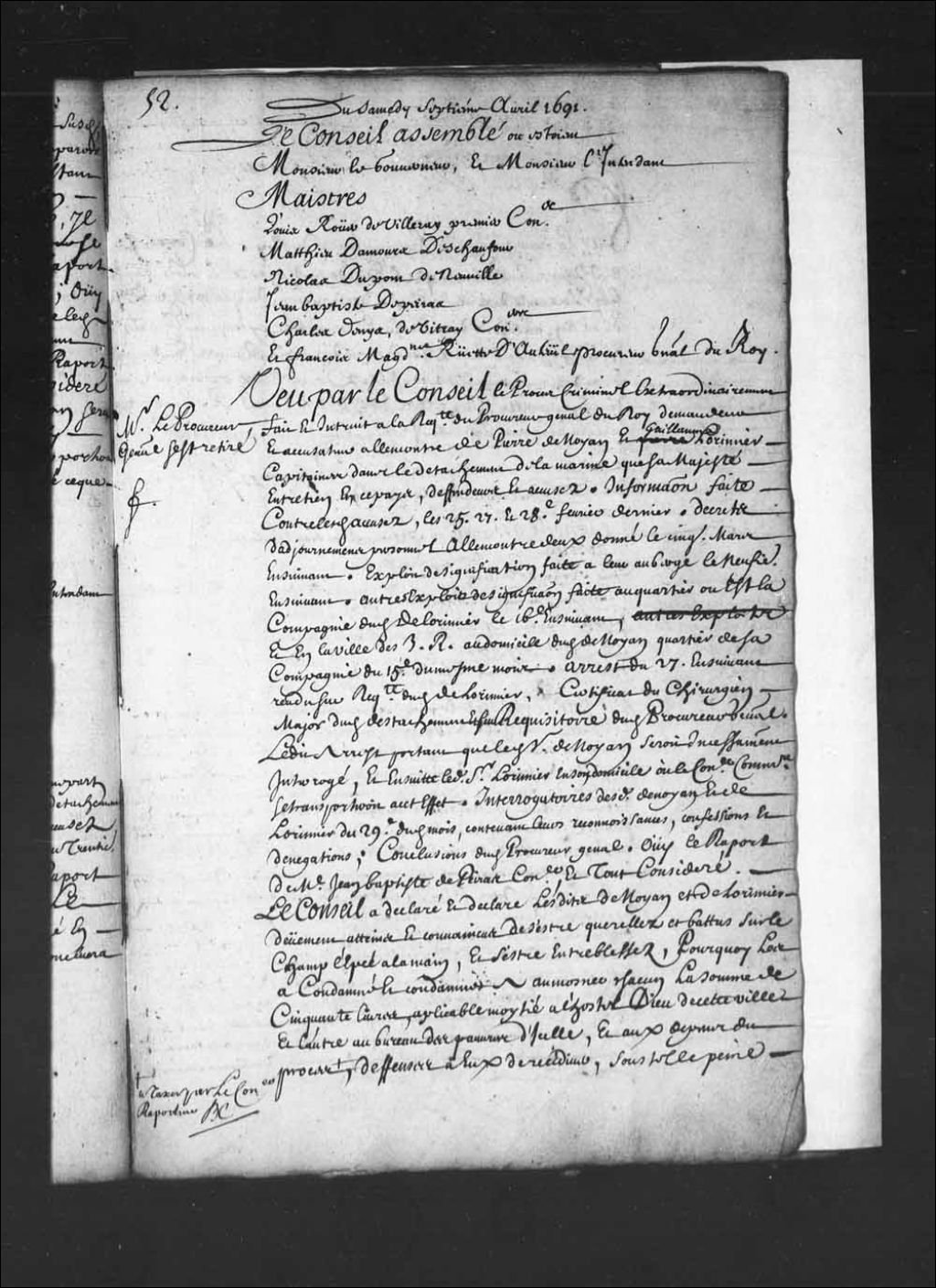 - Transcription du texte avec orthographe modernisée : «Du samedi septième avril 1691. Le Conseil assemblé où étaient Monsieur le gouverneur, et Monsieur l'intendant Maîtres Louis Rouer de Villeray premier conseiller. Mathieu Damours Deschaufour. Nicolas Dupont de Neuville. Jean-Baptiste Depeiras. Charles Denis, de Vitray conseillers. Et François Madeleine Ruette d'Auteuil procureur général du Roi. Monsieur le procureur général s'est retiré. Vu par le Conseil le procès criminel extraordinairement fait et instruit à la requête du procureur général du Roi demandeur et accusateur à l'encontre de Pierre de Noyan et Guillaume Lorimier capitaines dans le détachement de la marine que sa Majesté entretien en ce pays, défendeurs et accusés. Information faite contre lesdits accusés, les 25. 27. et 28e février dernier. Décrets d'ajournements personnels à l'encontre deux donné le cinq mars ensuivant. exploit de signification faite à leur auberge le [...]
