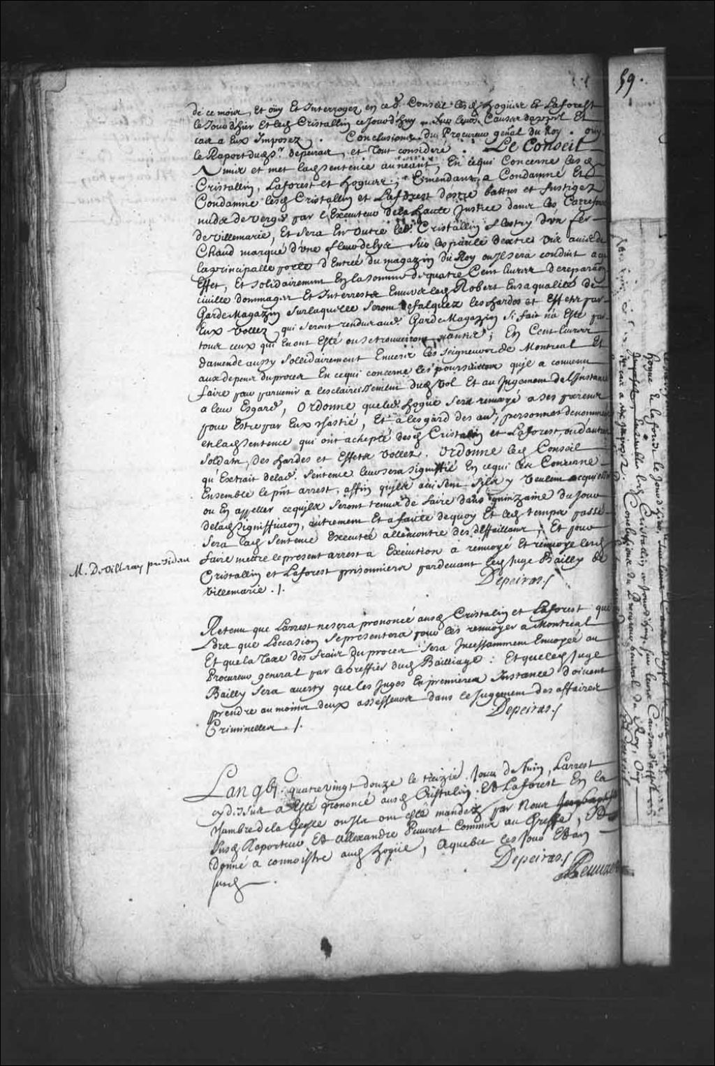 Transcription du texte avec orthographe modernisée : «Retenu que l'arrêt ne sera prononcé aux dit Cristalin et Laforest que lors que l'occasion se présentera pour les renvoyer à Montréal et que la taxe des frais du procès sera incessamment envoyée au procureur général par le greffier dudit bailliage: et que ledit juge bailli sera averti que les juges en première instance doivent prendre au moins deux assesseurs dans le jugement des affaires criminelles. DEPEIRAS. L'an mille six cent quatre-vingt-douze le treizième jour de juin, l'arrêt ci-dessus a été prononcé auxdits Cristalin et Laforest en la chambre de la geôle où ils ont été mandés par nous susdit rapporteur et Alexandre Peuvret commis au greffe, et donné à connaître audit Hogue, à Québec les jour et an susdits. DEPEIRAS PEUVRET.»