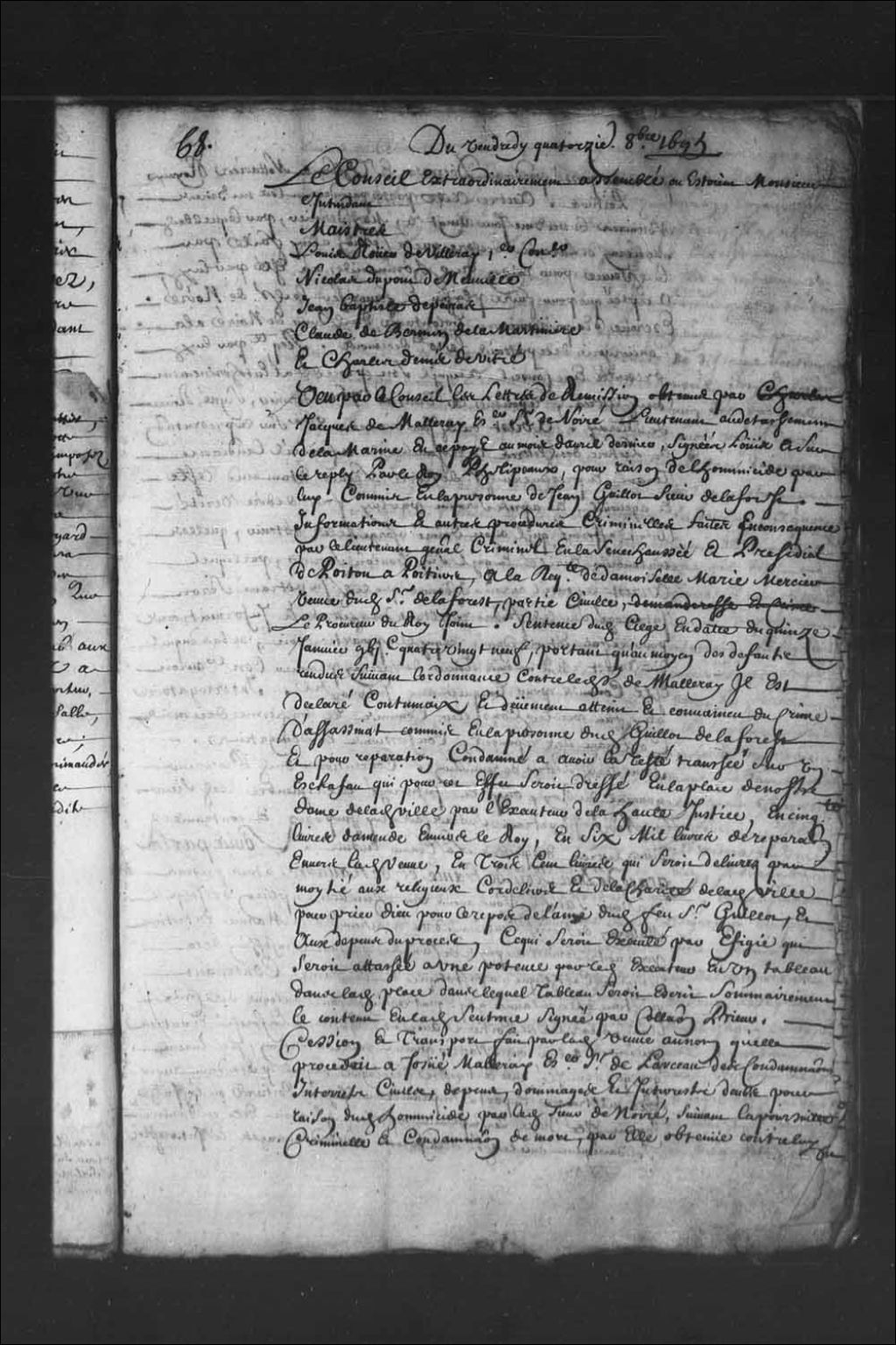 Transcription du texte avec orthographe modernisée : «Du vendredi quatorzième octobre 1695. Le Conseil extraordinairement assemblé où étaient Monsieur l'intendant Maîtres Louis Rouer de Villeray premier conseiller. Nicolas Dupont de Neuville. Jean-Baptiste Depeiras. Claude de Bermen de la Martinière. Et Charles Denys de Vitray. Vu par le Conseil les lettres de rémission obtenues par Jacques de Malleray (Maleray) écuyer sieur de Noiré lieutenant au détachement de la marine en ce pays au mois d'avril dernier, signées Louis et sur le repli par le Roi Phelipeaux, pour raison de l'homicide par lui commis en la personne de Jean Guillot sieur de Laforest. Informations et autres procédures criminelles faites en conséquence par le lieutenant général criminel en la sénéchaussée et présidial de Poitou à Poitiers, à la requête de demoiselle Marie Mercier veuve dudit sieur de Laforest, partie civile, le procureur du Roi joint. Sentence dudit siège [...]