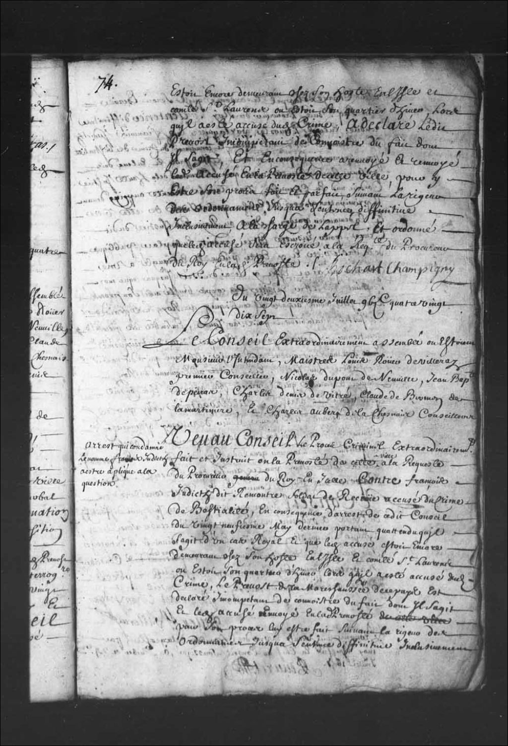 - Transcription du texte avec orthographe modernisée : «Du vingt-deuxième juillet mille six cent quatre-vingt-dix-sept. Le Conseil extraordinairement assemblé où étaient Monsieur l'intendant, maîtres Louis Rouer de Villeray premier conseiller, Nicolas Dupont de Neuville, Jean-Baptiste Depeiras, Charles Denys de Vitré, Claude de Bermen de La Martinière, et Charles Aubert de Lachesnais conseillers. Arrêt qui condamne le nommé François Judith (Judic) à être appliqué à la question. Vu au Conseil le procès criminel extraordinairement fait et instruit en la prévôté de cette ville à la requête du procureur du Roi en icelle contre François Judith dit Rencontre soldat de recrue accusé du crime de bestialité, en conséquence d'arrêt de ce dit Conseil du vingt-neuvième mai dernier portant qu'attendu qu'il s'agit d'un cas royal et que ledit accusé était encore demeurant chez son hôte en l'île et comté Saint-Laurent où était son quartier d'hiver lors [...]