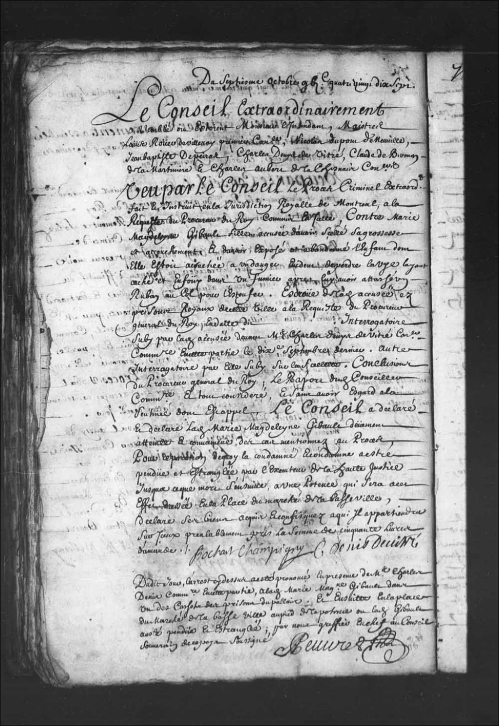 - Transcription du texte avec orthographe modernisée : «Du septième octobre mille six cent quatre-vingt-dix-sept. Le Conseil extraordinairement assemblé où étaient Monsieur l'intendant, maîtres Louis Rouer de Villeray premier conseiller, Nicolas Dupont de Neuville, Jean-Baptiste Depeiras, Charles Denys de Vitré, Claude de Bermen de La Martinière et Charles Aubert de Lachesnais conseillers. Vu par le Conseil le procès criminel extraordinairement fait et instruit en la juridiction royale de Montréal, à la requête du procureur du Roi commis en icelle, contre Marie Madeleine Gibault fille, accusée d'avoir scellé sa grossesse et accouchement et d'avoir exposé et abandonné l'enfant dont elle était accouchée à un danger évident de perdre la vie l'ayant caché et enfoui dans un panier après lui avoir attaché un ruban au col pour l'étouffer. Écrou de ladite accusée des prisons royaux de cette ville à la requête du procureur général du Roi, en date du (...)Interrogatoire subi par ladite accusée devant maître Charles Denys de Vitré conseiller commissaire en cette partie le dixième septembre dernier. Autre interrogatoire par elle subi sur la sellette. Conclusions du procureur général du Roi; le rapport dudit conseiller commissaire et tout considéré, et sans avoir égard à la sentence dont est appel, le Conseil a déclaré et déclare ladite Marie Madeleine Gibault dûment atteinte et convaincue des cas mentionnés au procès, pour réparation de quoi l'a condamné et condamne à être pendue et étranglée par l'exécuteur de la haute justice jusqu'à ce que mort s'ensuive, à une potence qui sera à cet effet dressée en la Place du marché de la basse-ville, déclare ses biens acquis et confisqués à qui il appartiendra sur iceux préalablement pris la somme de cinquante livres d'amende. BOCHART CHAMPIGNYC. DENYS DE VITRÉ. Dudit jour, l'arrêt ci-dessus a été prononcé en présence de maître Charles Denis commissaire en cette partie, à ladite Marie Madeleine Gibault dans un des cachots des prisons du palais. Et ensuite en la place du marché de la basse-ville au pied de la potence ou ladite Gibault a été pendue et étranglée; par nous greffier en chef au Conseil souverain de ce pays soussigné. PEUVRET.»