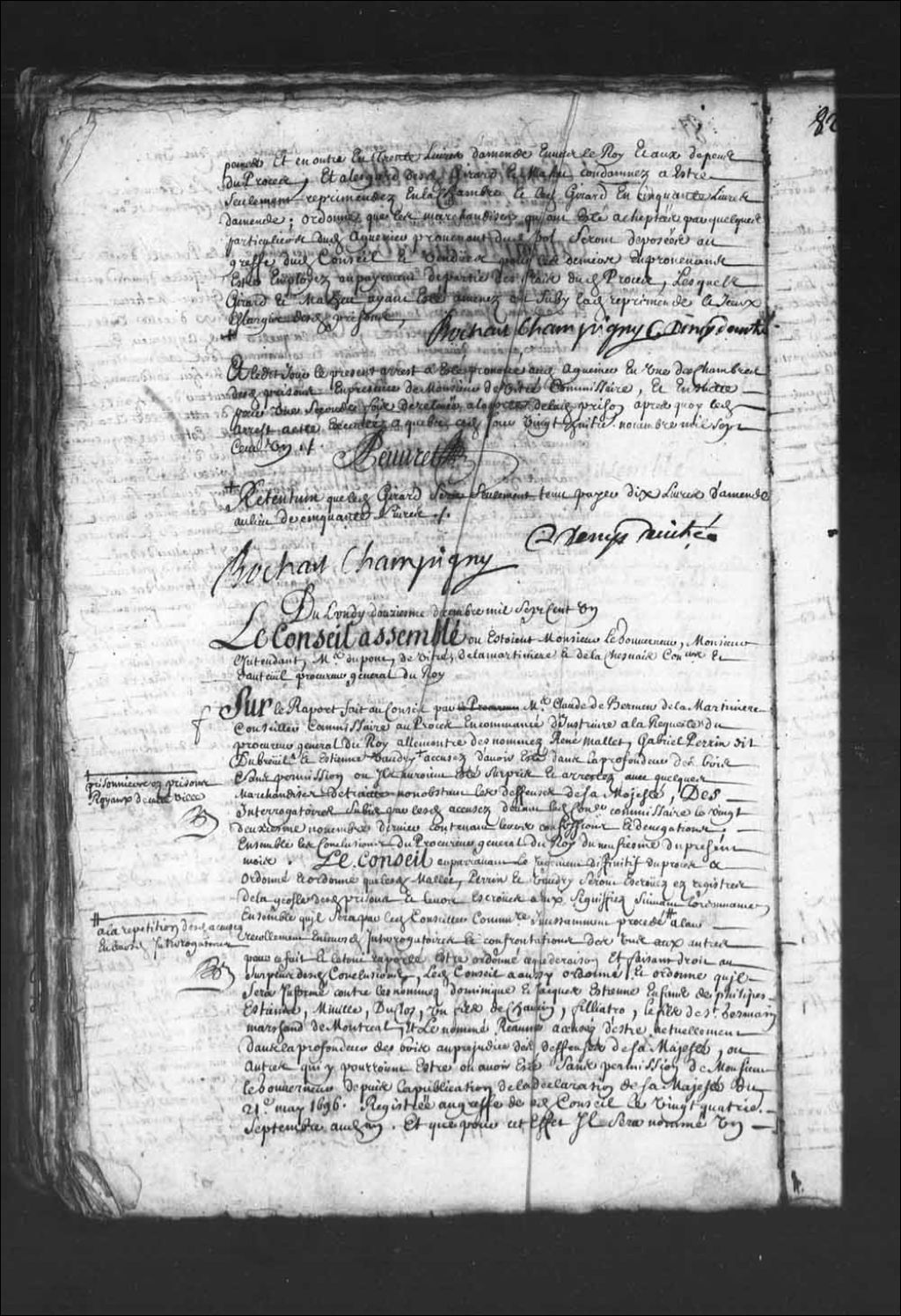 - Transcription du texte avec orthographe modernisée : «Du lundi douzième décembre mille sept cent un. Le Conseil assemblé où étaient Monsieur le gouverneur, Monsieur l'intendant, maîtres Dupont, de Vitré, de La Martinière et de Lachesnais conseillers et d'Auteuil procureur général du Roi. Sur le rapport fait au Conseil par maître Claude de Bermen de la Martinière conseiller commissaire au procès encommencé d'instruire à la requête du procureur général du Roi à l'encontre des nommés René Mallet, Gabriel Perrin dit Dubreuil et Etienne Vaudry prisonniers des prisons royaux de cette ville accusés d'avoir été dans la profondeur des bois sans permission ou ils auraient été surpris et arrêtés avec quelques marchandises de traite nonobstant les défenses de sa Majesté, des interrogatoires subis par lesdits accusés devant ledit conseiller commissaire le vingt-deuxième novembre dernier contenant leurs confessions et dénégations; ensemble les conclusions du procureur général du Roi du neuvième du présent mois. Le Conseil auparavant le jugement définitif du procès a ordonné et ordonne que lesdits Mallet, Perrin et Vaudry seront écroués aux registres de la geôle desdites prisons et leurs écrous à eux signifiés suivant l'ordonnance ensemble qu'il sera par ledit conseiller commissaire incessamment procédé à la répétition desdits accusés en leurs dit interrogatoires à leur récolement en leurs dit interrogatoires et confrontations des uns aux autres pour ce fait et le tout rapporté être ordonné ce que de raison et faisant droit au surplus desdites conclusions, ledit Conseil a aussi ordonné et ordonne qu'il sera informé contre les nommés Dominique et Jacques Etienne enfants de Philippe Etienne, Miville, Duclos, un fils de Chauvin, filiatro (Filiatreau), le fils de Saint-Germain marchand de Montréal, et le nommé Reaume (Réaume) accusés d'être actuellement dans la profondeur des bois au préjudice des défenses de sa Majesté, ou autres qui y pourraient être ou avoir été sans permission de Monsieur le gouverneur depuis la publication de la déclaration de sa Majesté du 21e mai 1696 registrée au greffe de ce dit Conseil le vingt-quatrième septembre audit an. Et que pour cet effet il sera nommé un des conseillers en icelui qui se transportera aussitôt que les chemins le pourront permettre avec ledit procureur général et le greffier en chef du Conseil à Montréal et autres lieux que besoin sera aux fins de procéder aux dites informations, décréter et faire au surplus tout ce qui sera nécessaire jusqu'à arrêt définitif exclusivement pour l'entière recherche et punition des réfractaires aux défenses de sa dite Majesté, pour ce fait et la procédure rapportée en ce dit Conseil être ordonné ce qu'il appartiendra. BOCHART CHAMPIGNY»
