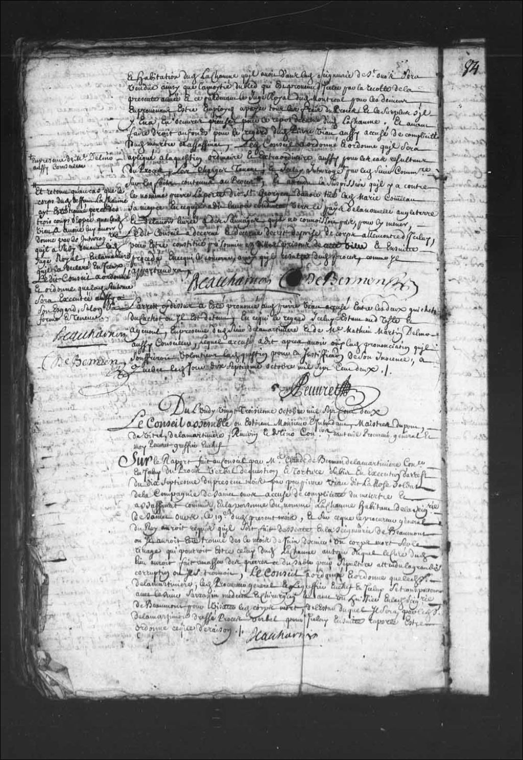 Prononcé de l'arrêt du Conseil confirmant la sentence d'un procès criminel fait en la Juridiction royale de Montréal à Pierre Viau dit Larose, soldat du détachement de la Marine de la Compagnie de Saint-Ours, en présence du sieur de la Martinière et de Me Mathieu Martin Delino (De Lino), conseillers, 17 octobre 1702, Archives nationales à Québec, Fonds Conseil souverain, (03Q,TP1,S28,P2574).
