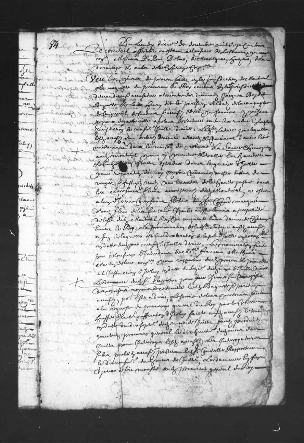 - Transcription du texte avec orthographe modernisée : «Du lundi dixième de décembre mille sept cent trois. Le Conseil assemblé où étaient Monsieur de Lotbinière premier conseiller, Messieurs DuPont, Delino (De Lino), de Monseignat, Hazeur, de Ladurantaie et Aubert de Lachesnaie conseillers. Vu les pièces du procès faits en la juridiction de Montréal à la requête du procureur du Roi commis en ladite juridiction demandeur et accusateur à l'encontre des nommés Jacques Boy dit baguette et Louis Henri dit le Parisien soldat de la compagnie de Longueuil défendeurs et accusés de vol prisonniers des prisons royaux de cette ville appelants de sentence contre eux rendue en ladite juridiction le neuvième juillet dernier. Ladite sentence par laquelle lesdits accusés sont déclarés dûment atteints et convaincus d'avoir entré nuitamment dans la maison du nommé La Source chirurgien audit Montréal pour y prendre et voler les hardes et linge qui étaient [...]