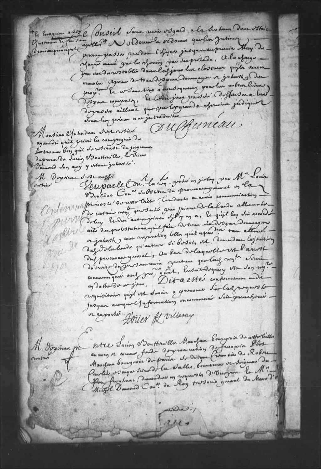 - Transcription du texte avec orthographe modernisée : «Monsieur l'intendant s'est retiré ayant dit qu'il priait la compagnie de trouver bon qu'il se retirât du jugement du procès de Lucien Boutteville, le sieur Damond son ami y étant intéressé. Monsieur Depeiras s'est aussi retiré. Vu par le Conseil la requête présentée en icelui par maître Louis Boulduc conseiller substitut du procureur général en la prévôté de cette ville, tendante à avoir communication de certaine requête présentée par Pierre de Lalande à l'encontre de lui et des autres pièces s'il y en a, et qu'il lui soit accordé acte des protestations qu'il fait de tous ses dépens dommages et intérêts avec réparation telle qu'il appartiendra tant à l'encontre dudit de Lalande qu'autres si besoin est, demandant la jonction dudit procureur général, au bas de laquelle est l'arrêt du treizième du présent mois portant que ladite requête serait communiquée audit procureur général, ensuite de quoi est son réquisitoire en date de ce jour, dit a été conformément audit réquisitoire qu'il est sursis à prononcer sur ladite requête jusqu'à ce que l'information encommencée soit parachevée et rapportée. ROUER DE VILLERAY.»