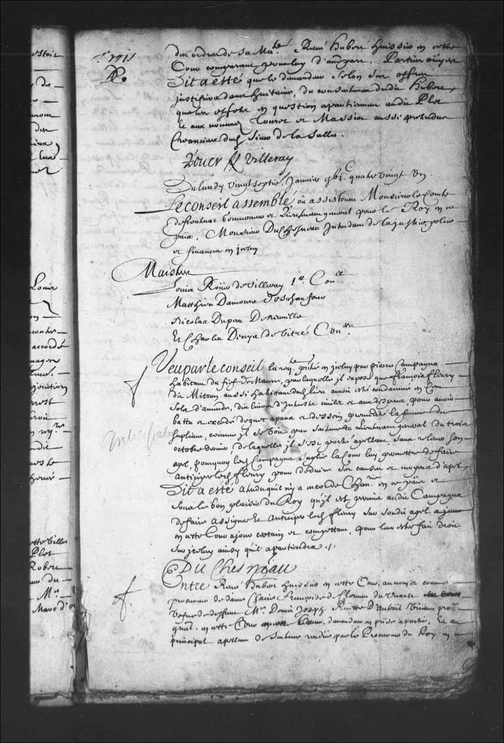 - Transcription du texte avec orthographe modernisée : «Entre René HUBERT huissier en cette Cour, au nom et comme procureur de dame Claire Françoise de Clément Duvault veuve de défunt maître Denis Joseph Ruette d'Auteuil vivant procureur général en cette Cour, demandeur en prise à partie, et au principal appelant de sentence rendue par le procureur du Roi en la prévôté de cette ville le quatorze juin dernier, au profit de Jean LeChasseur, au nom et comme procureur de maître Jean Gayet conseiller commissaire ordinaire des guerres créancier de la succession dudit défunt sieur d'Auteuil, d'une part, et maître Louis BOULDUC procureur du Roi en ladite prévôté défendeur sur ladite prise à partie et incidemment demandeur en requête contre Gilles Rageot greffier de ladite prévôté d'autre. Vu la sentence dont est appel, l'acte de la déclaration d'icelui et de ladite prise à partie, du même jour quatorze juin, signifié audit procureur du Roi par l'huissier Roger le dix-huit, moyens de ladite prise à partie, signifiés le vingt-neuvième juillet par ledit Roger, réponses à iceux datées du sixième août dernier, non signifiés, et tout ce qui a été sur ce produit; arrêt du premier juillet intervenu sur requête présentée par ledit procureur du Roi contre ledit Rageot, avec un dire par addition du dixième du même mois, et un procès-verbal dudit procureur du Roi, du deuxième dudit mois de juillet; conclusions de maître Claude de Bermen conseiller procureur général, commis en cette partie, le rapport de maître Mathieu Damours aussi conseiller en cette dite Cour, tout considéré. Dit a été que les réponses à ladite prise à partie seront signifiées audit Hubert audit nom, et que ledit Rageot aura communication des pièces ci-dessus énoncées qui le concernent pour y répondre et être fait droit à la huitaine. DUCHESNEAU.»
