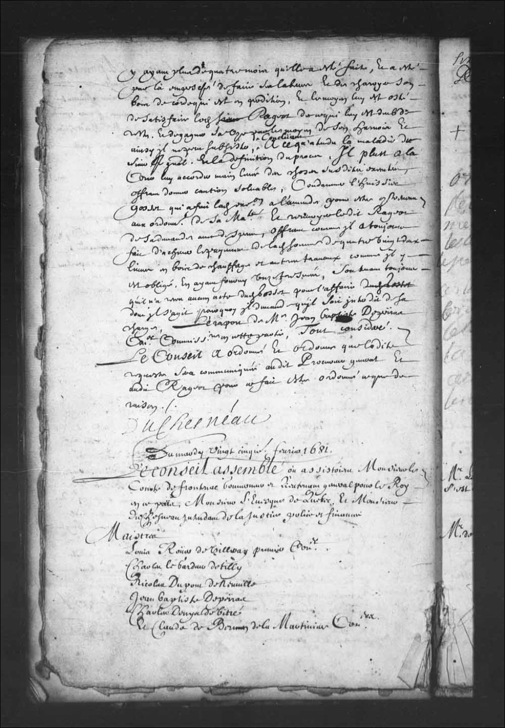 - Transcription du texte avec orthographe modernisée : «Du mardi vingt-cinquième février 1681. Le Conseil assemblé où assistaient Monsieur le comte de Frontenac gouverneur et lieutenant général pour le Roi en ce pays, Monsieur l'évêque de Québec, et Monsieur Duchesneau intendant de la justice police et finances. Maîtres. Louis Rouer de Villeray premier conseiller. Charles Legardeur de Tilly. Nicolas Dupont de Neuville. Jean-Baptiste Depeiras. Charles Denys de Vitré. Et Claude de Bermen de la Martinière conseillers. Et maître François Madeleine Ruette d'Auteuil procureur général. Vu par le Conseil les lettres patentes du Roi données à Fontainebleau le septième juillet dernier, signées Louis et sur le repli par le Roi Colbert, et à côté visa Le Tellier pour amortissement, signé Colbert, et scellées du grand sceau de cire verte sur laque de soie rouge et verte, par lesquelles sa Majesté accorde aux religieuses ursulines de cette ville l'amortissement a perpétuité de quelques portions de terres et héritages par elles acquis en cette ville, et le long de la Grande Allée, savoir vingt et une perches proche leur commune acquise de la veuve Pierre de joybert écuyer sieur de Marson, deux arpents dix perches aussi joignant leur commune, et un arpent et demi de front sur douze de profondeur ou environ, sur la Grande Allée tenant aux terres par elles acquises des Brassards, acquises par elles de Noël Pinguet, et vingt-cinq arpents de terres acquises par elles desdits Brassards, pour en jouir par lesdites religieuses et celles qui leur succéderont franchement et quittancées, sans qu'elles soient tenues d'en vider leurs mains, ni bailler honneur vivant et mourant ni payer à sa Majesté aucunes finances et indemnité, droits seigneuriaux, franc fiefs et nouveaux acquêts ni autres droits ainsi qu'il est plus au long exprimé par lesdites patentes adressées en ce Conseil pour y être registrées et du contenu en icelles jouir par lesdites religieuses ursulines et celles qui leur succéderont, requête desdites impétrantes afin dudit enregistrement au bas de laquelle est l'arrêt portant que lesdites patentes seront montrées au procureur général, du 23e décembre dernier, conclusions dudit procureur général du 23e janvier dernier. Monsieur le procureur général s'est retiré. Le rapport de maître Louis Rouer de Villeray premier conseiller en cette Cour, tout considéré. Dit a été que lesdites lettres patentes seront registrées au greffe de cette dite Cour, pour jouir par lesdites religieuses ursulines du contenu en icelles. Monsieur de Villeray rapporteur. DUCHESNEAU.»